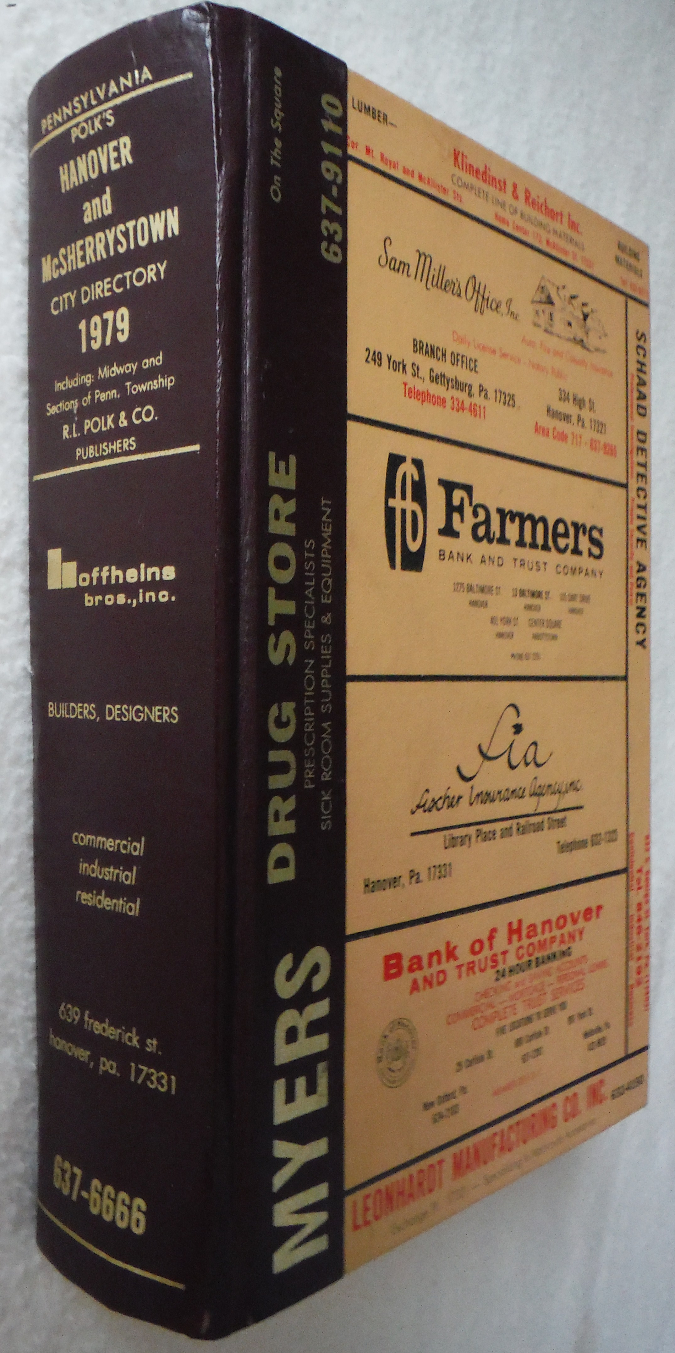 Contains Bonneauville references, e.g., page 204, "Johnny Jako emp. Bonnieville" [sic]. This directory contains the names of many of the establishments that Bonneauville residence did business with since the small town had so few businesses of her own. At this period in time many town residents preferred to "go to town," meaning to shop in Hanover, rather than patronize Bonneauville stores. The selections were much greater and the jaunts were usually a short pleasant getaway.