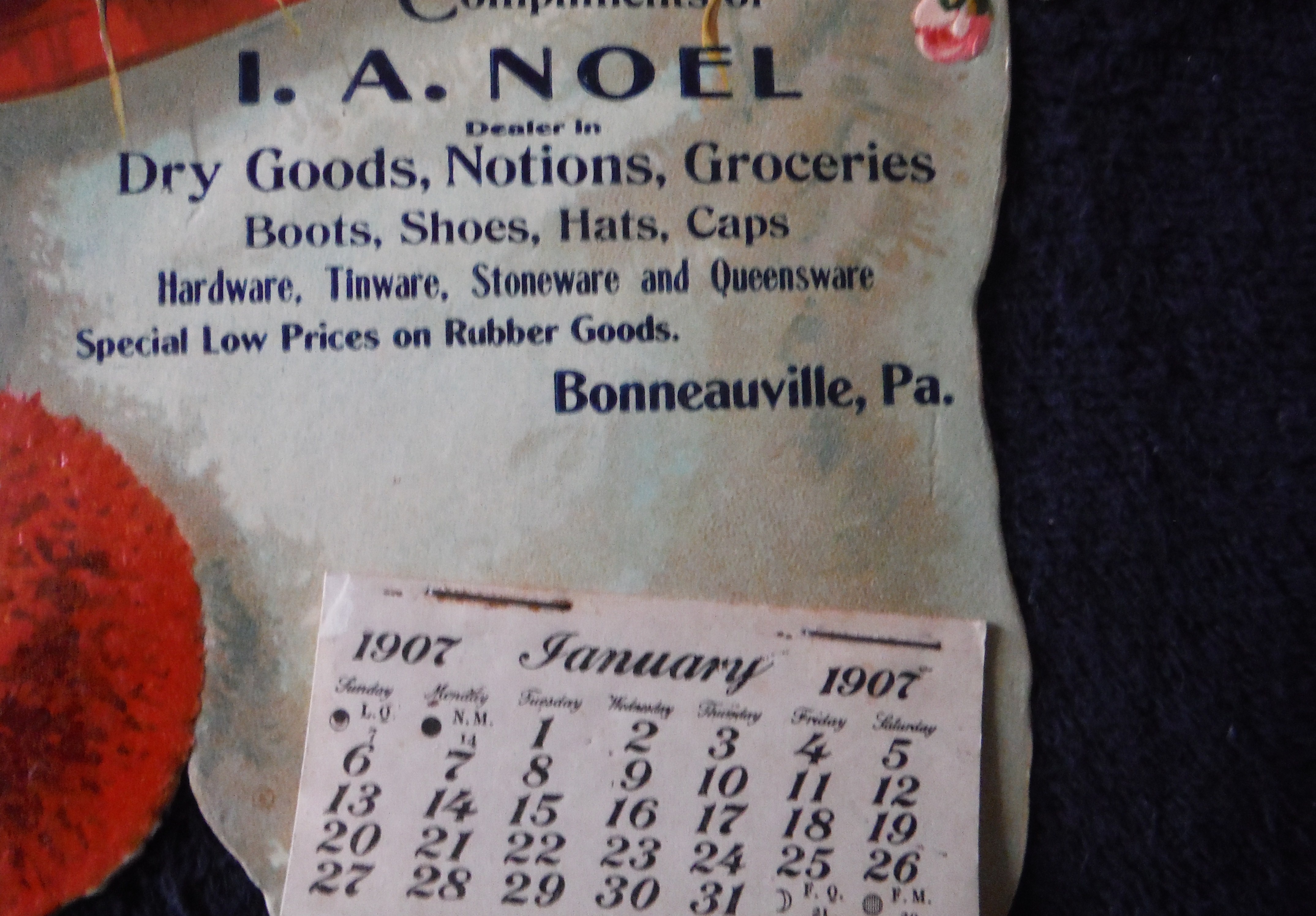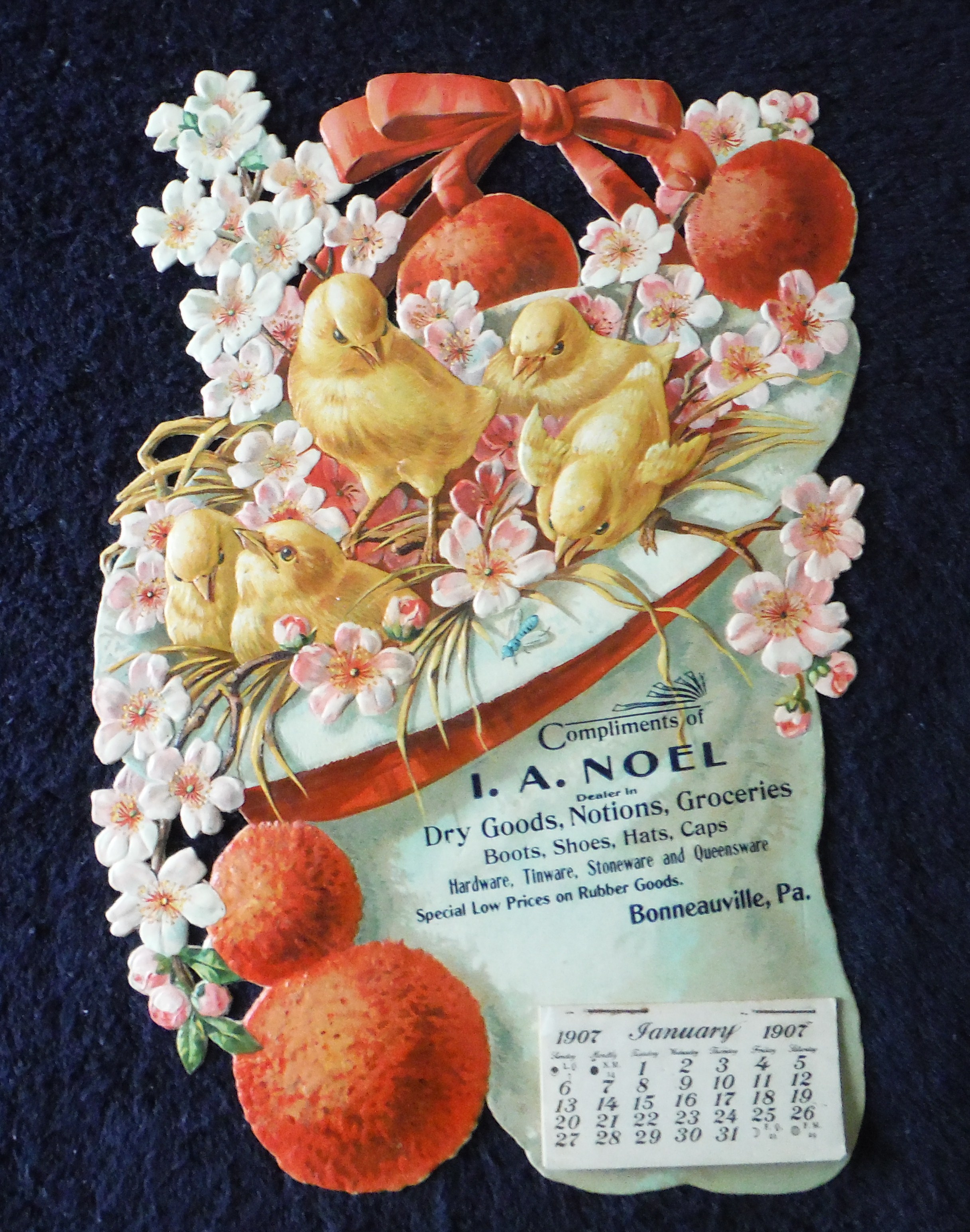 1907, I. A. Noel, Bonneauville, PA calendar in immaculate condition. Chromolithographic, embossed art.