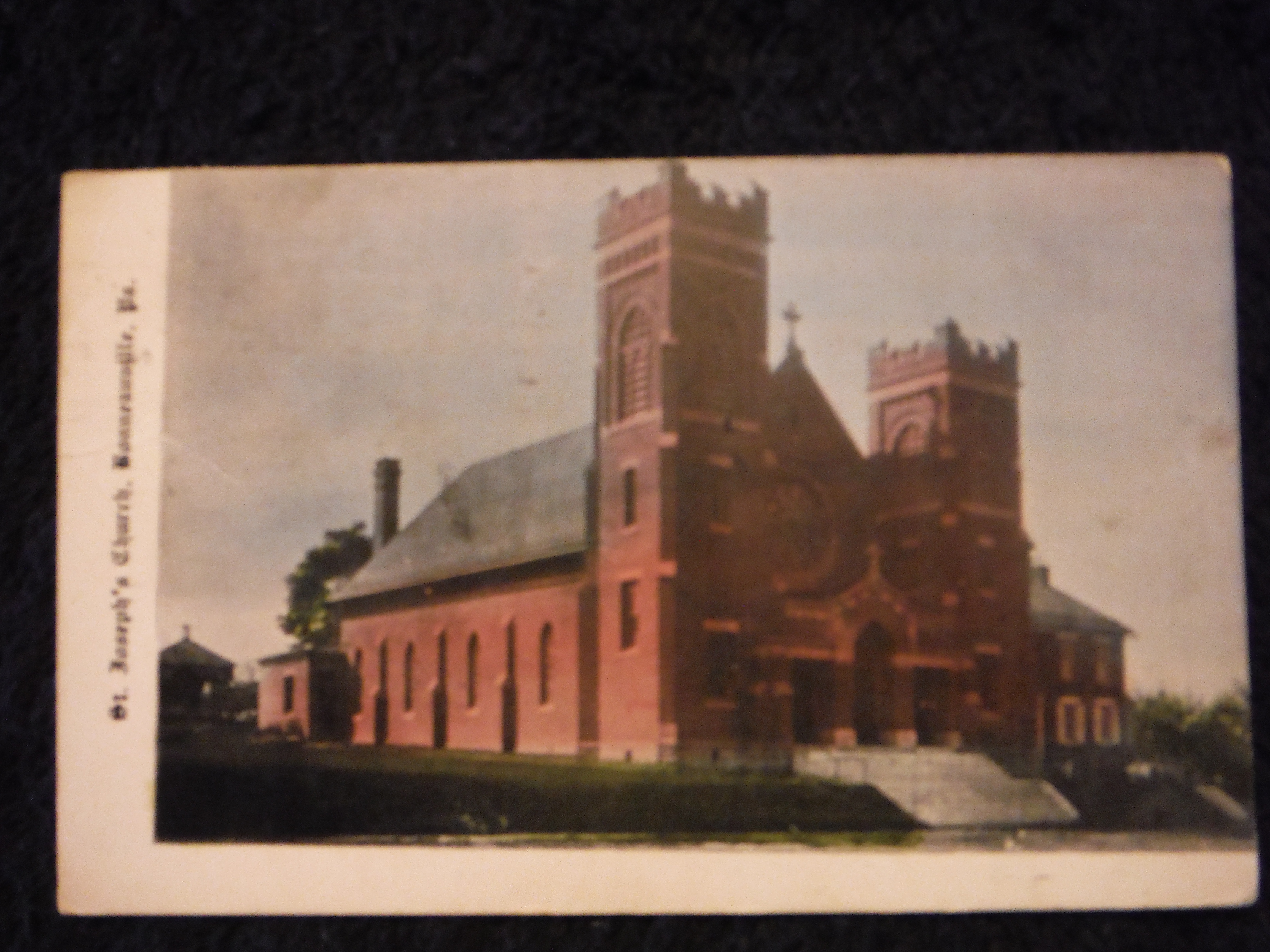 This postcard was printed for the rededication of St. Joseph's Church in Bonneauville in 1908. The card is addressed to I. V. Noel, a prominent businessman of Bonneauville in the early years of the 20th Century. Mr. Noel moved to Flatbush near Littlestown but continued to support St. Joseph's Church in Bonneauville. Around 1909 the old wood church was enveloped in brick. Bell towers and stained glass windows were added. The completion of the project was synchronized with the 50th Anniversary of the church. The old rectory to the right was torn down in 2013. A convent was constructed to the left of the church in 1958. It now serves as the parish rectory.