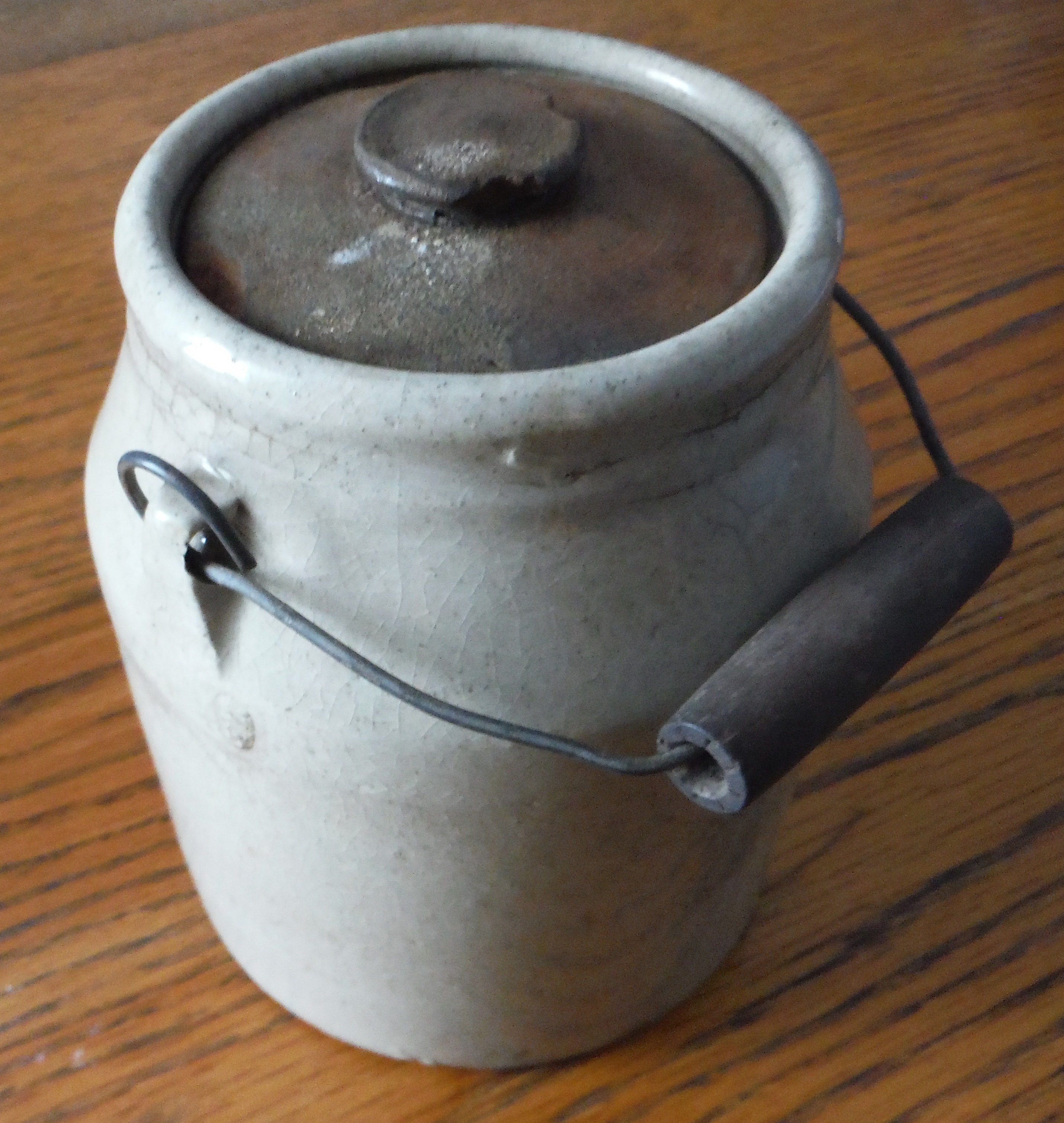 White stoneware crock with bale handle and brown lid. From Ambrose and Bertha (Wachter) Myers, who lived on the farm at 3 Cedar Street in Bonneauville, to their daughter Louise of 21 E. Hanover Street, Bonneauville.