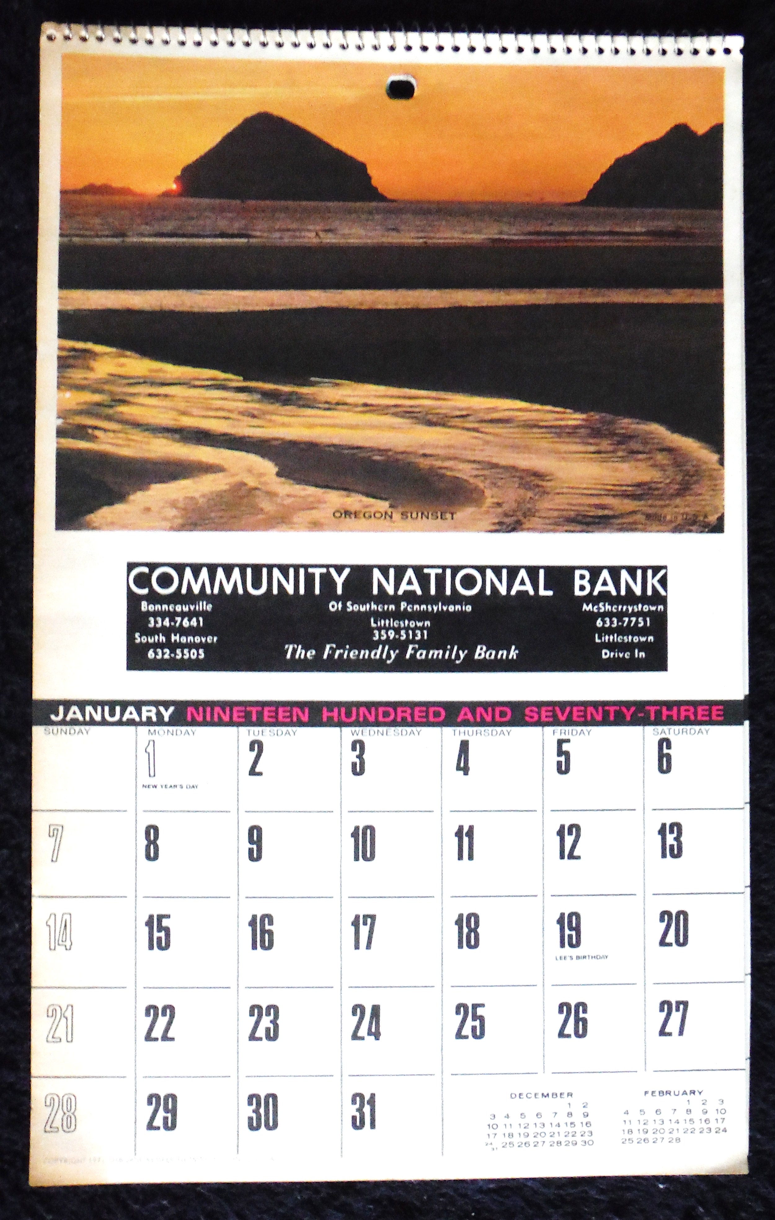 Calendar; 1973, Community National Bank, Bonneauville, PA