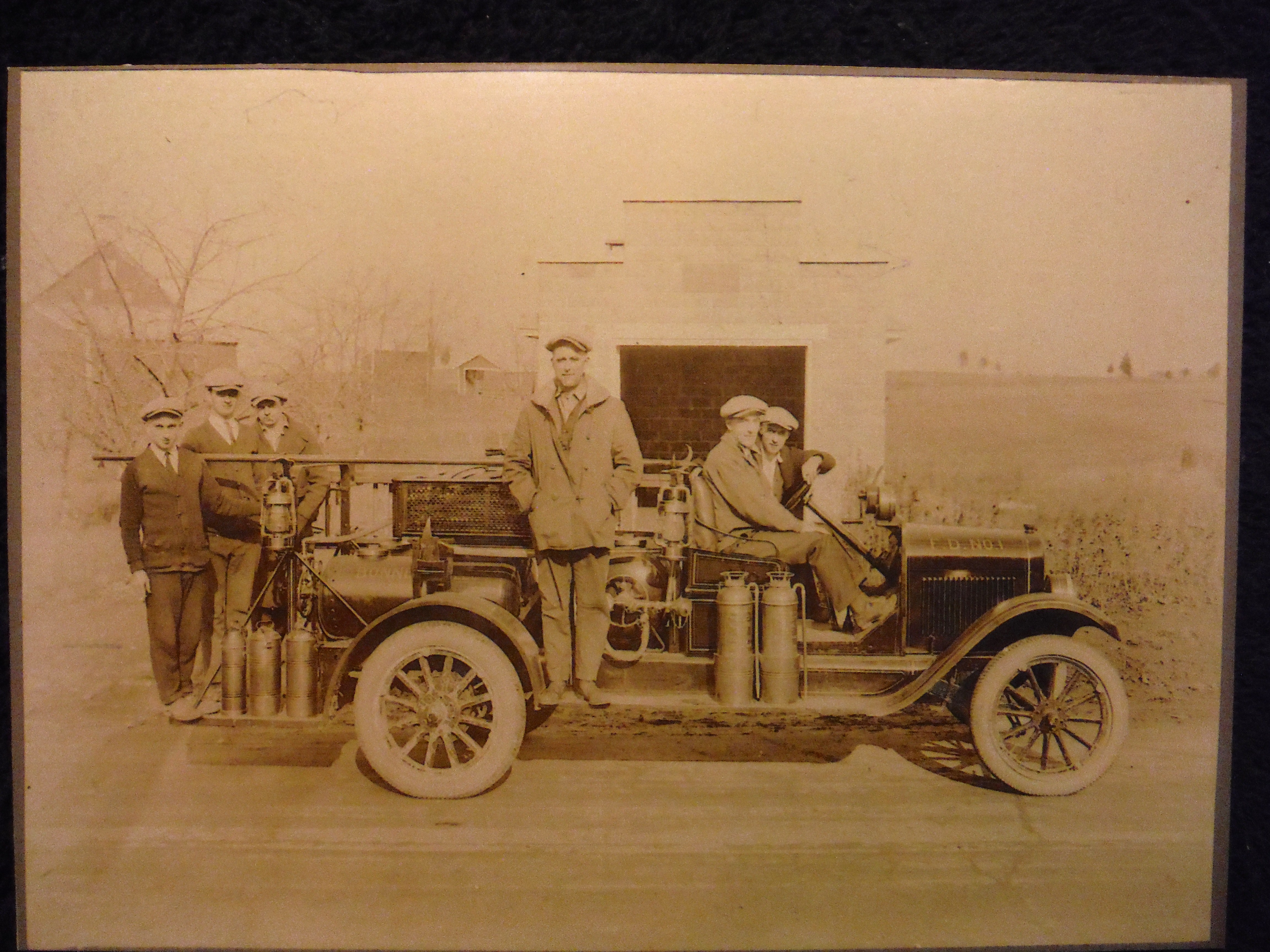 Bonneauville Fire Company's first Firetruck, a 1925 Chevrolet. The vehicle's occupants are unidentified. The building in the immediate background is Bonneauville's first firehouse. The structure now serves as a garage for the residence at 19 E. Hanover Street. The Cletus Myers farm, (later Ambrose Myers farm) can be seen faintly in the background. It was from that farm that land for the firehouse (and the building lots on the north side of East Hanover Street) was carved.