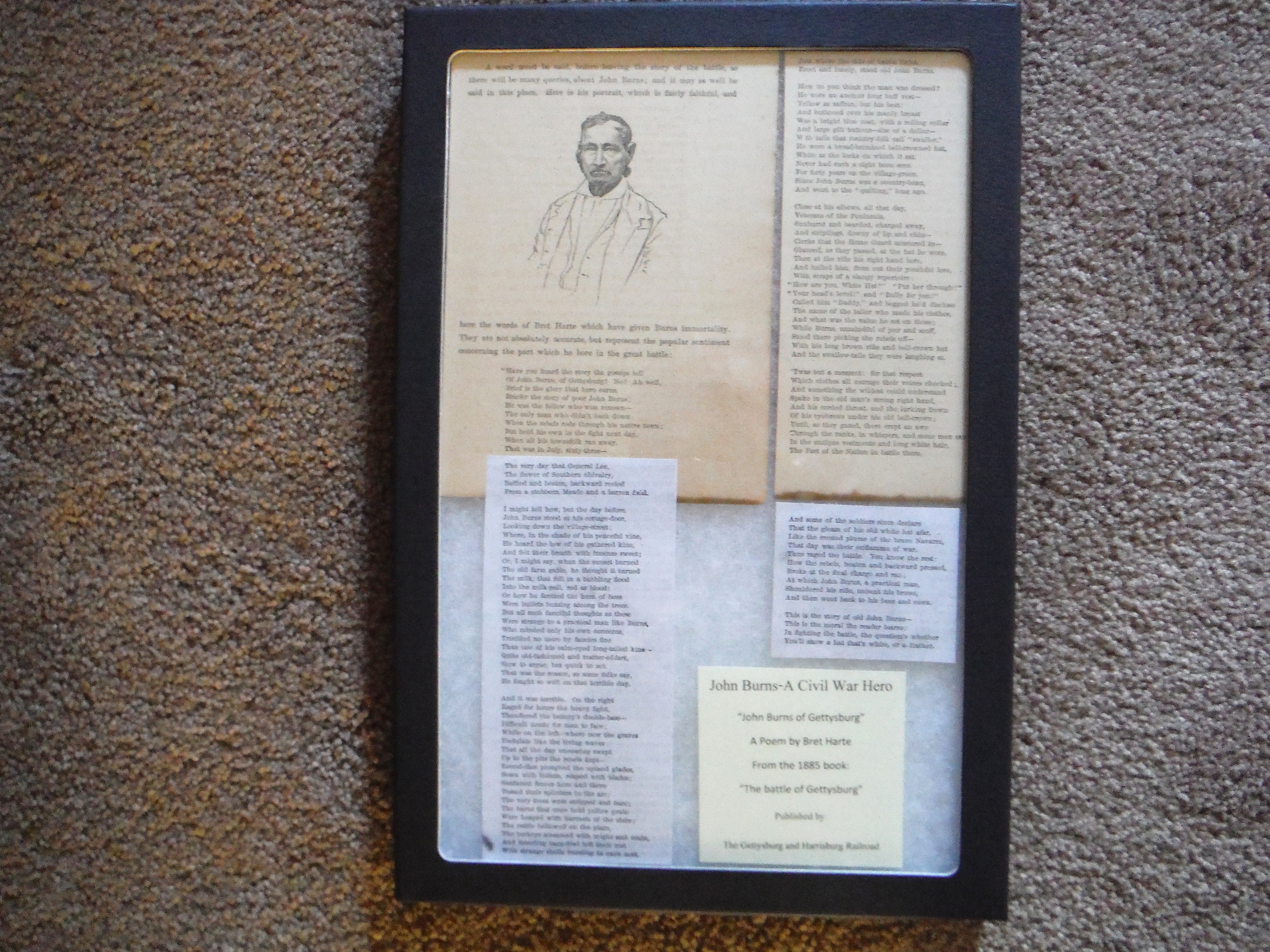 John Burns, "A Civil War Hero" 1885 leaflet. Contains a poem by Bret Harte titled "John Burns of Gettysburg." Published by the Gettysburg and Harrisburg Railroad Company. John Burns, who lived in Bonneauville both before and after the Civil War, heroically fought on the first day of the Battle of Gettysburg - as a civilian.