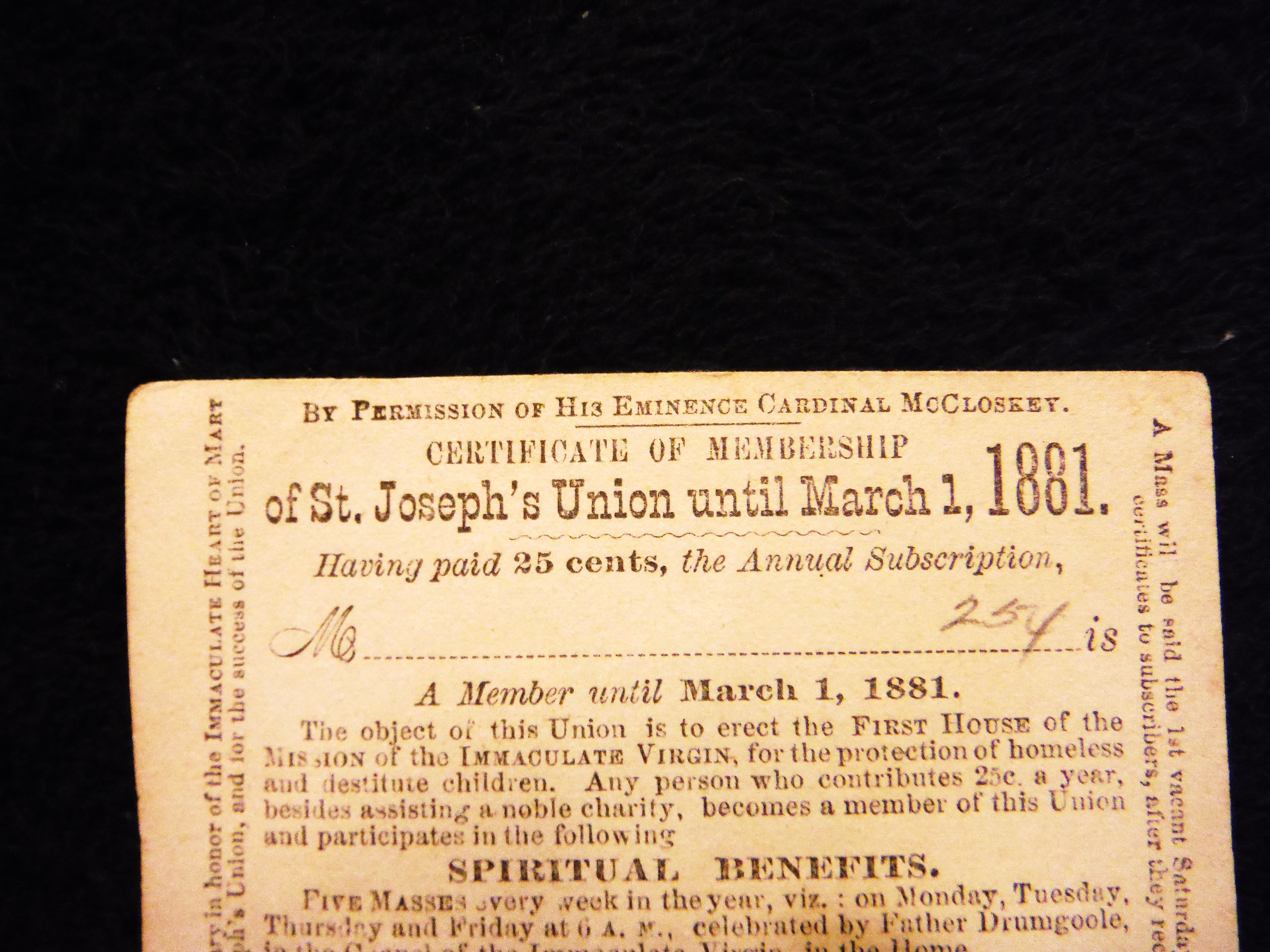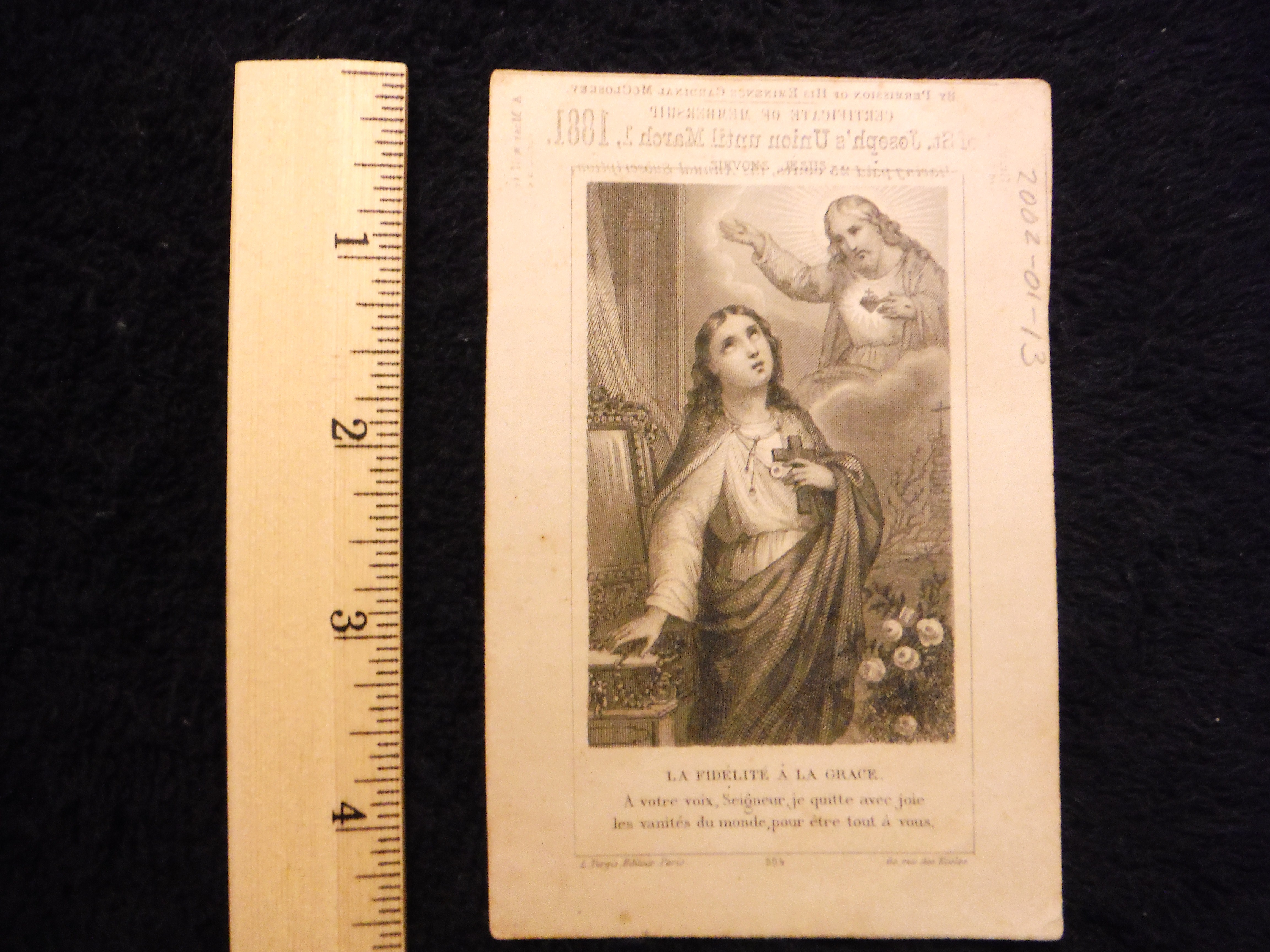 From the Mamie Neiderer Collection. Obverse; Jesus and Mary, text in Latin. Reverse; Rules and benefits. Penciled "254" (Same no. as Laurence (Lawrence?) card above. Note; There was a Laurence (Lawrence?) family living in Bonneauville in the late 1800's who gave orphan boy (later famous author) John T. Reily, a place to live.