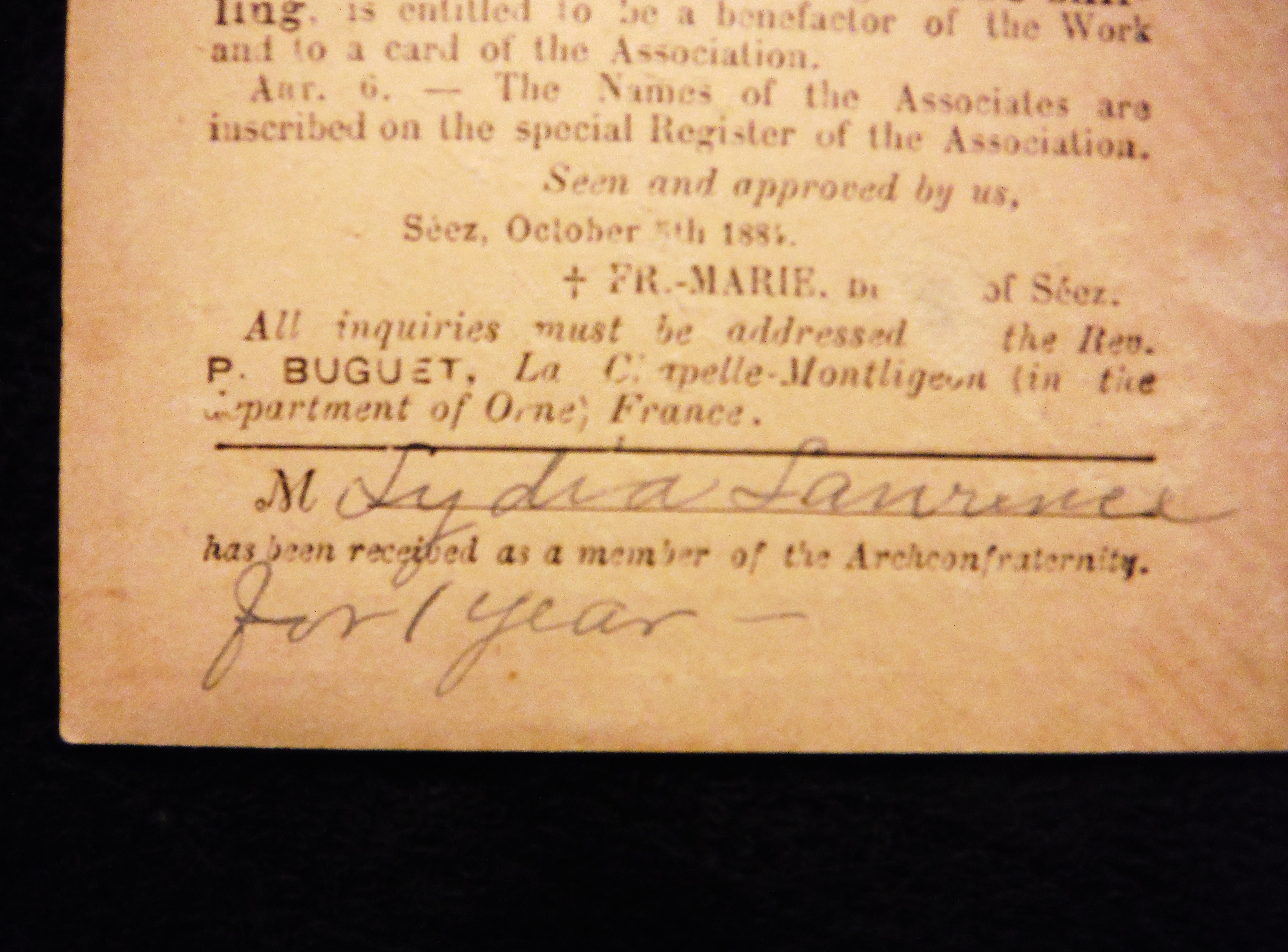 From the Mamie Neiderer Collection. Obverse; Various etched religious scenes, text in Latin. Reverse; Statutes. Penned; "254, Lydia Laurence (Lawrence?), for 1 year."
