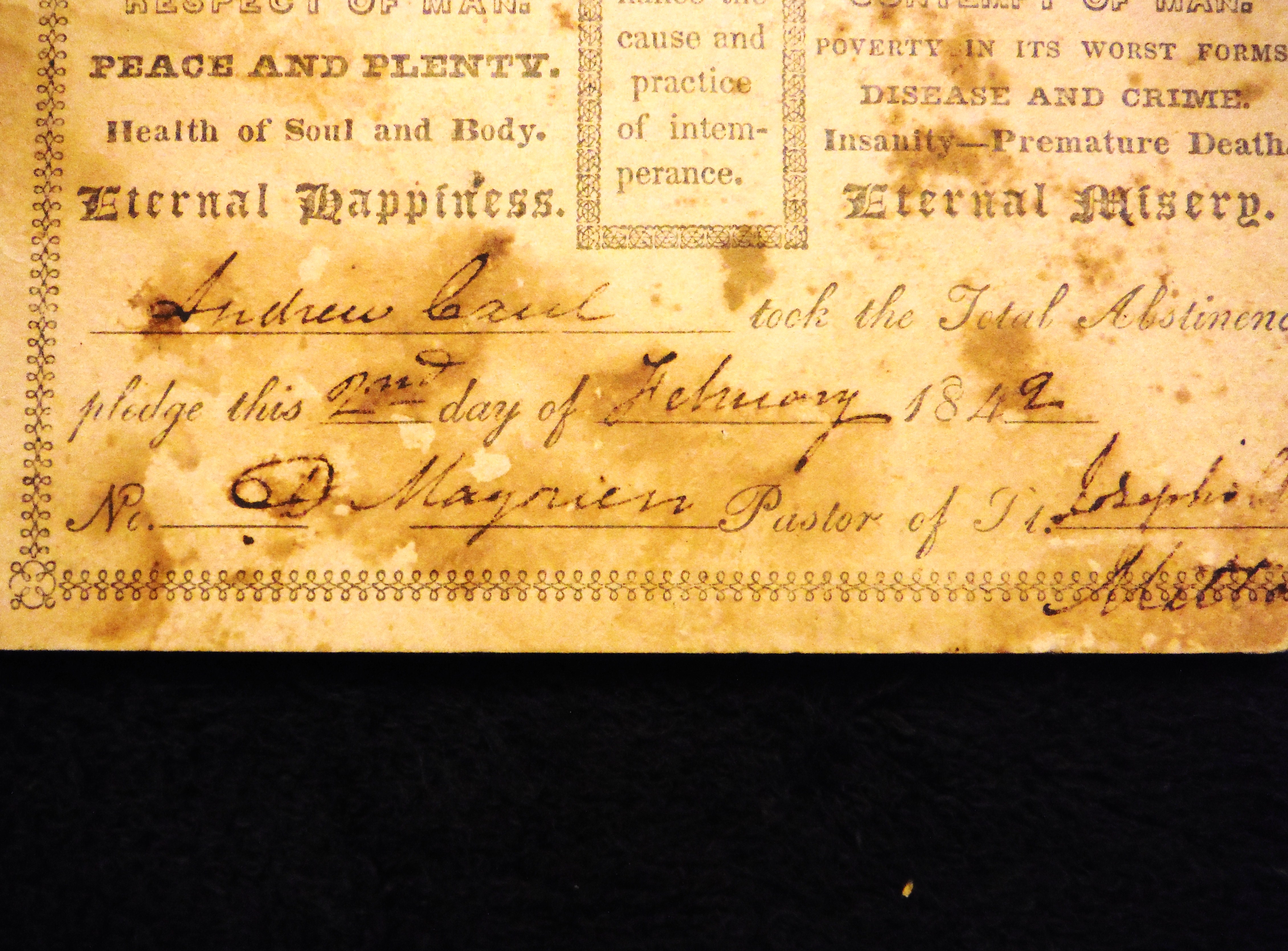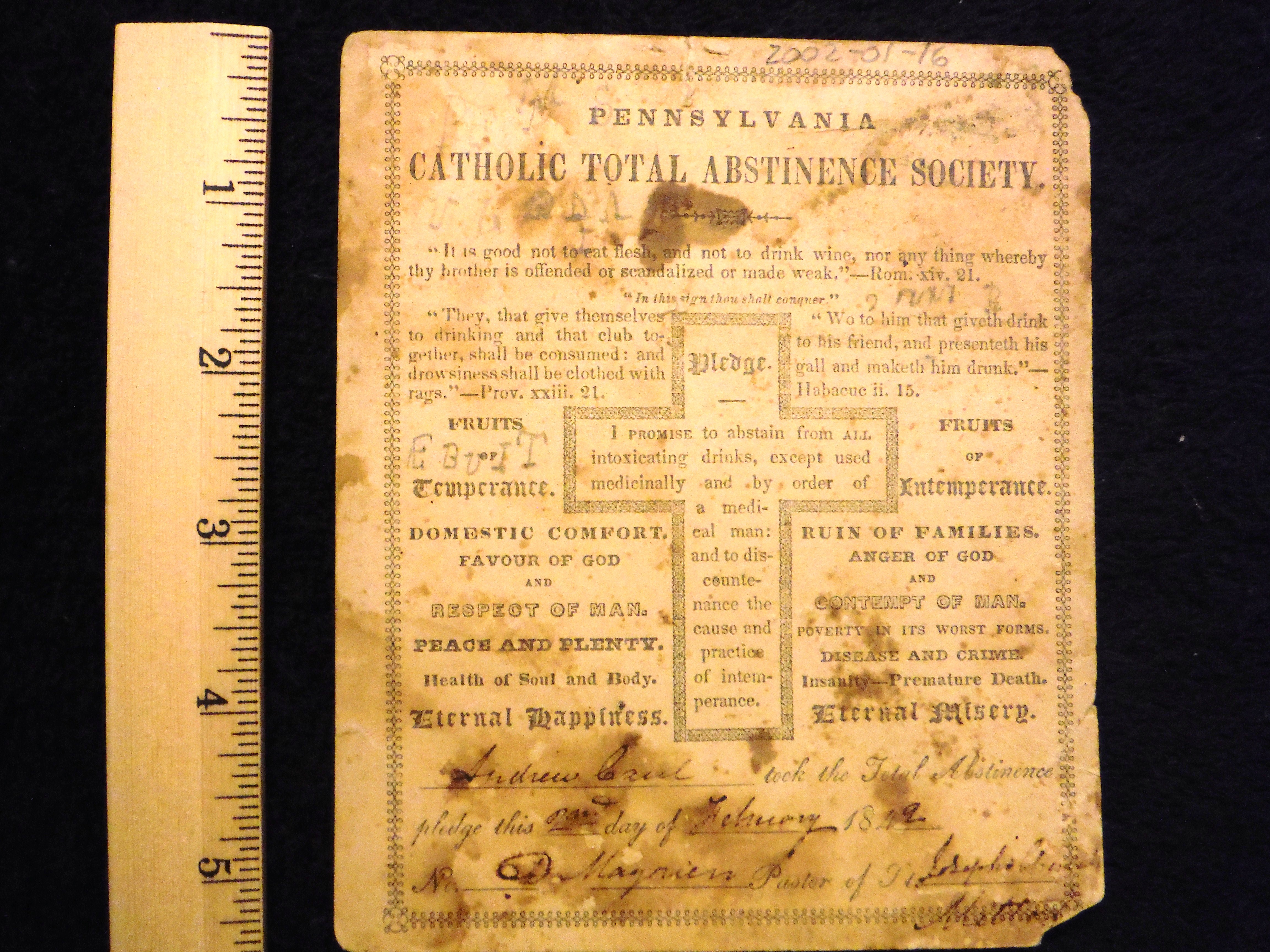 Obverse penned; "Andrew ___ took the total abstinence pledge this 2nd day of February, 1842. No.6, D. Mag___, Pastor of St. Joseph___" Reverse penciled; "Aloysius M. Laurence (Lawrence?), Bonneauville, Adams County, Pa, March 18th, 1883, A, March, 1883."