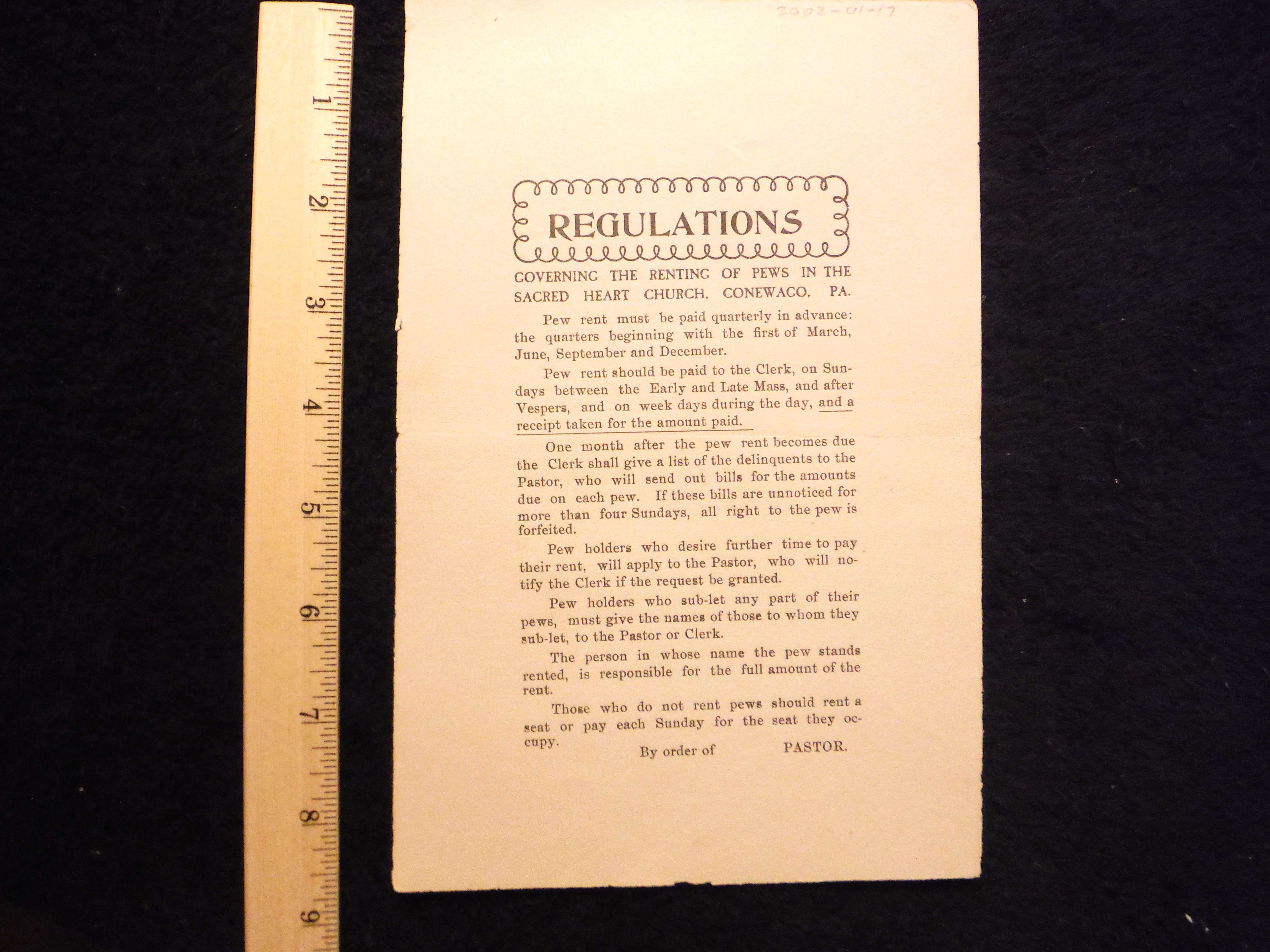 Regulations; "Covering The Renting of Pews in the Sacred Heart Church, Conewago, PA."