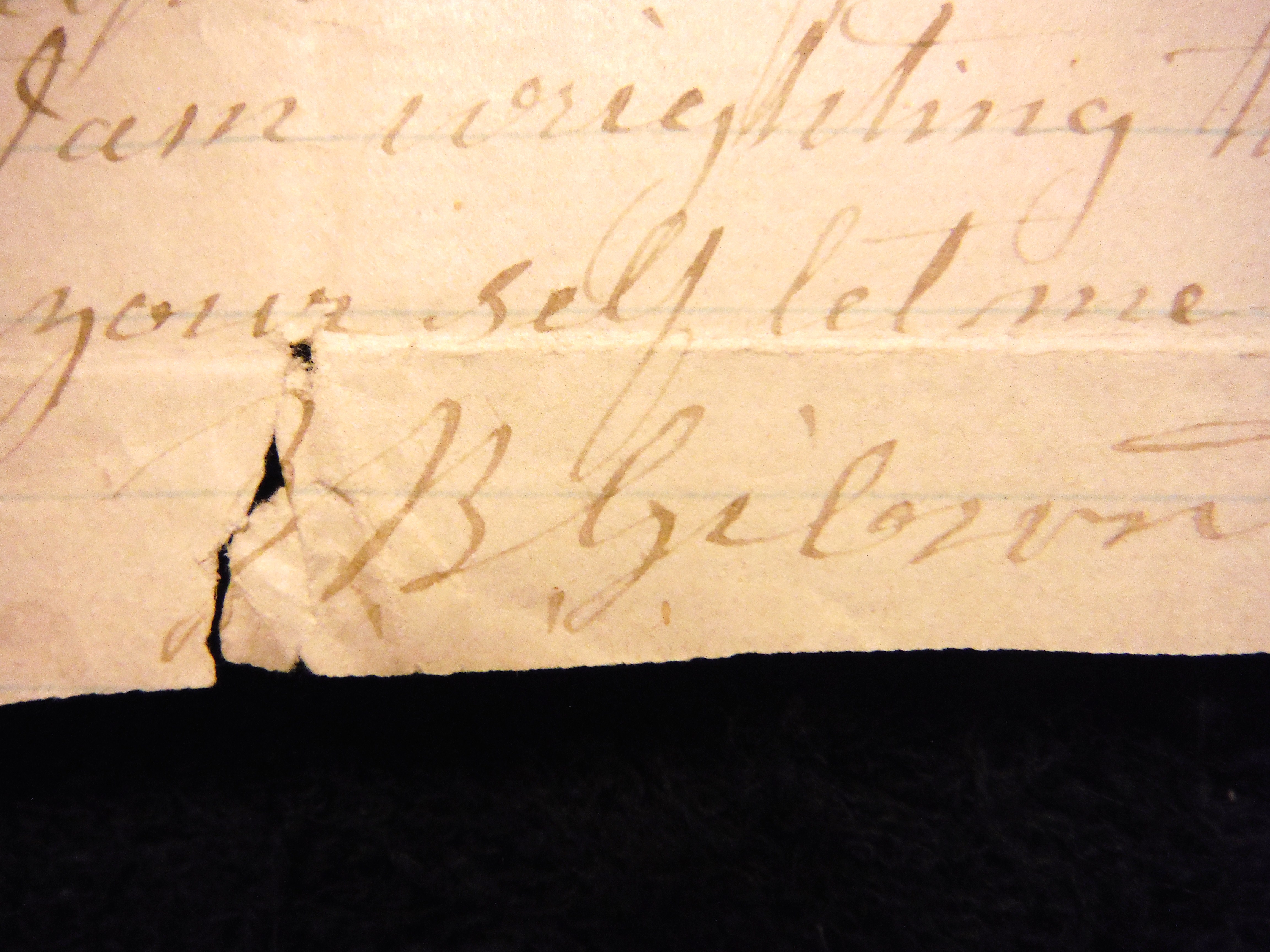 This faded ink letter came from the Mamie Neiderer Scrap Book Collection. Re: legal advice, cautions and wills. Signed; "_ B. Gibson."