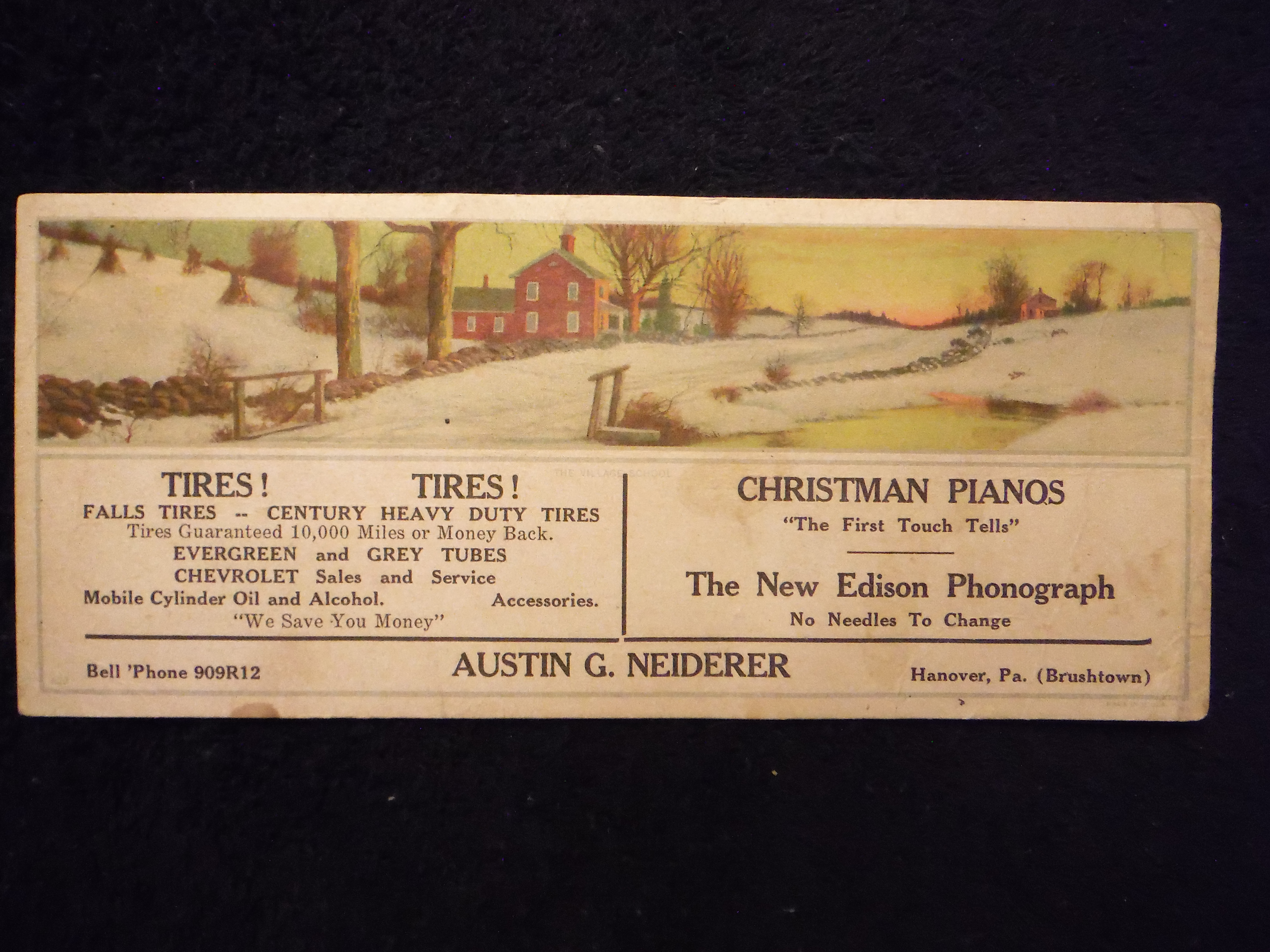 Ink blotter advertising was common in the first half of the 20th Century and before. The intent was that each time a drop of ink from a fountain pen formed, it was immediately absorbed with a blotter before it smeared. Each time a blotter was implemented it's advertising would be revealed to the user. Before moving to Bonneauville, Austin Neiderer lived in Brushtown, PA. There he sold tires, auto parts and Christian brand pianos as advertised on this blotter. Note phone no. 909R12.