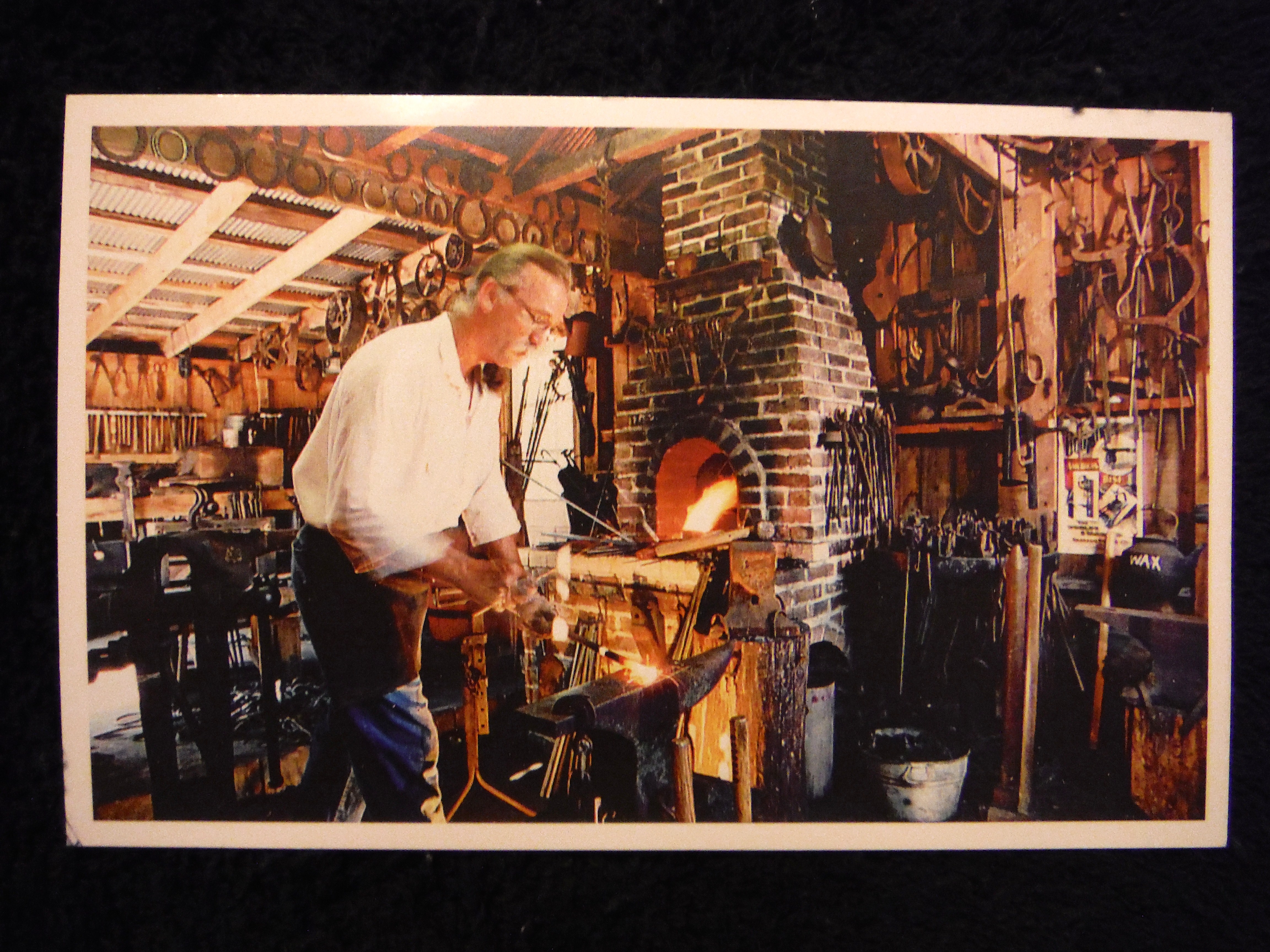 This postcard was made from a photo of Karl Orndorff and Pine Knob Iron Works blacksmith shop in Bonneauville, PA. The photographer is the famed James Stamfield of National Geographic Magazine. In this series of photo study shots, Mr. Stamfield captured the early morning sunrise as both the light of daybreak and the forge fire lit the shop's interior.