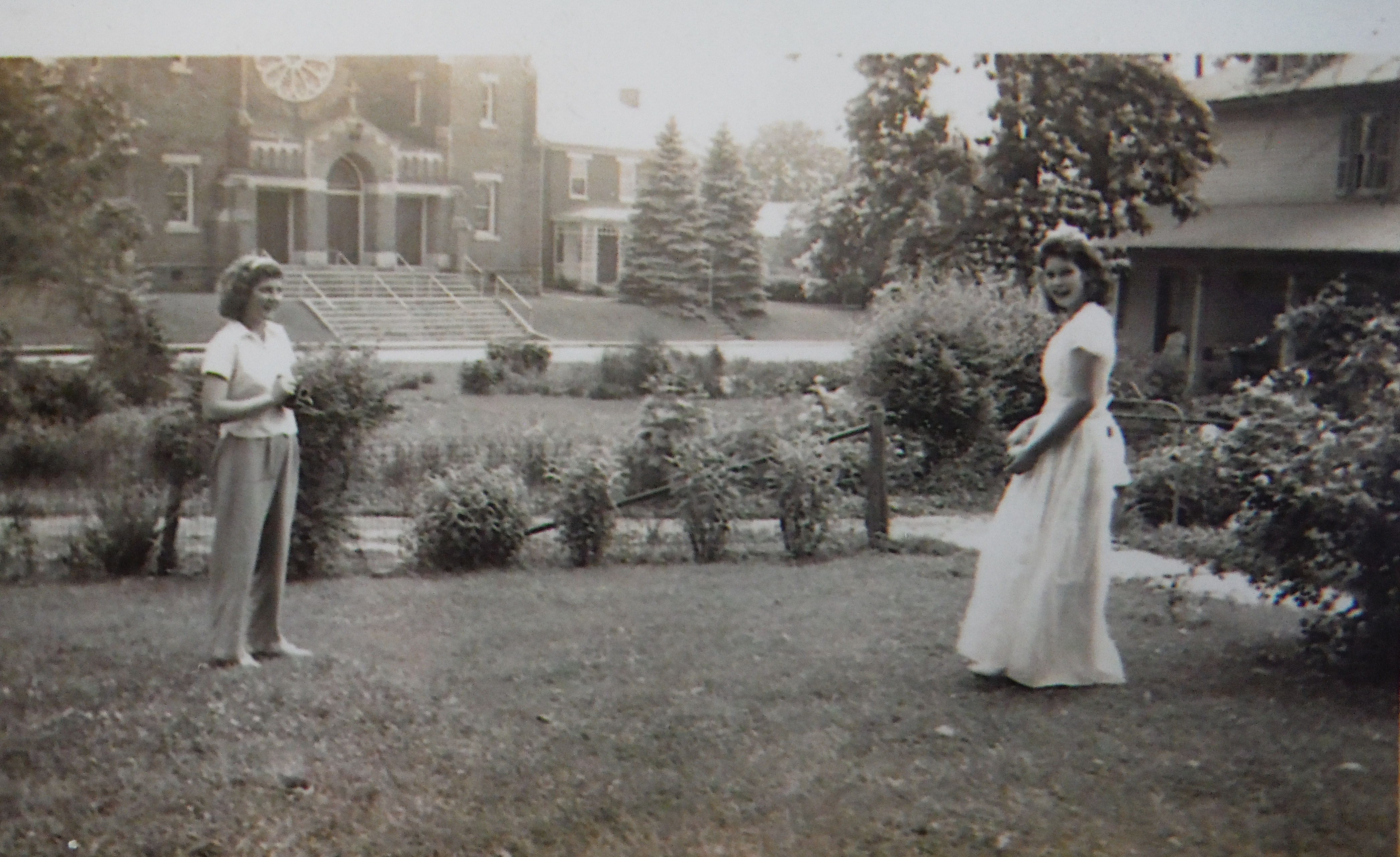 Angela and Louise Myers; daughters of Ambrose and Bertha Myers of 3 Cedar St. Shot taken at the East Hanover St. residence of Emma and Mary Myers. St Joseph's Church in the background. The rectory to the right of the church was torn down in 2013.