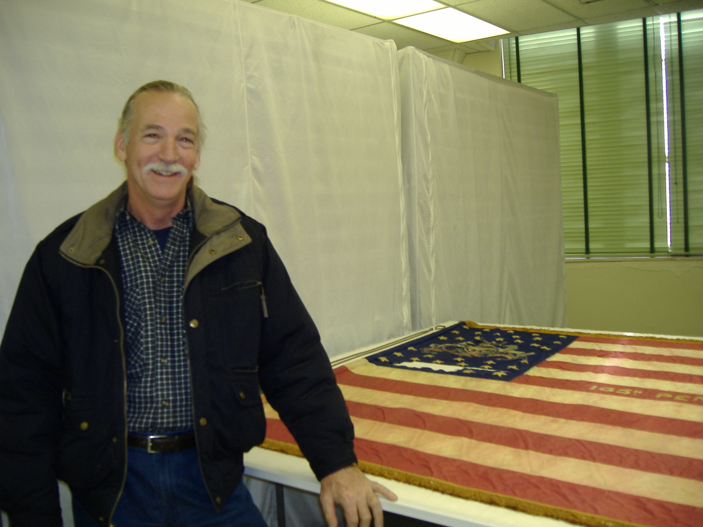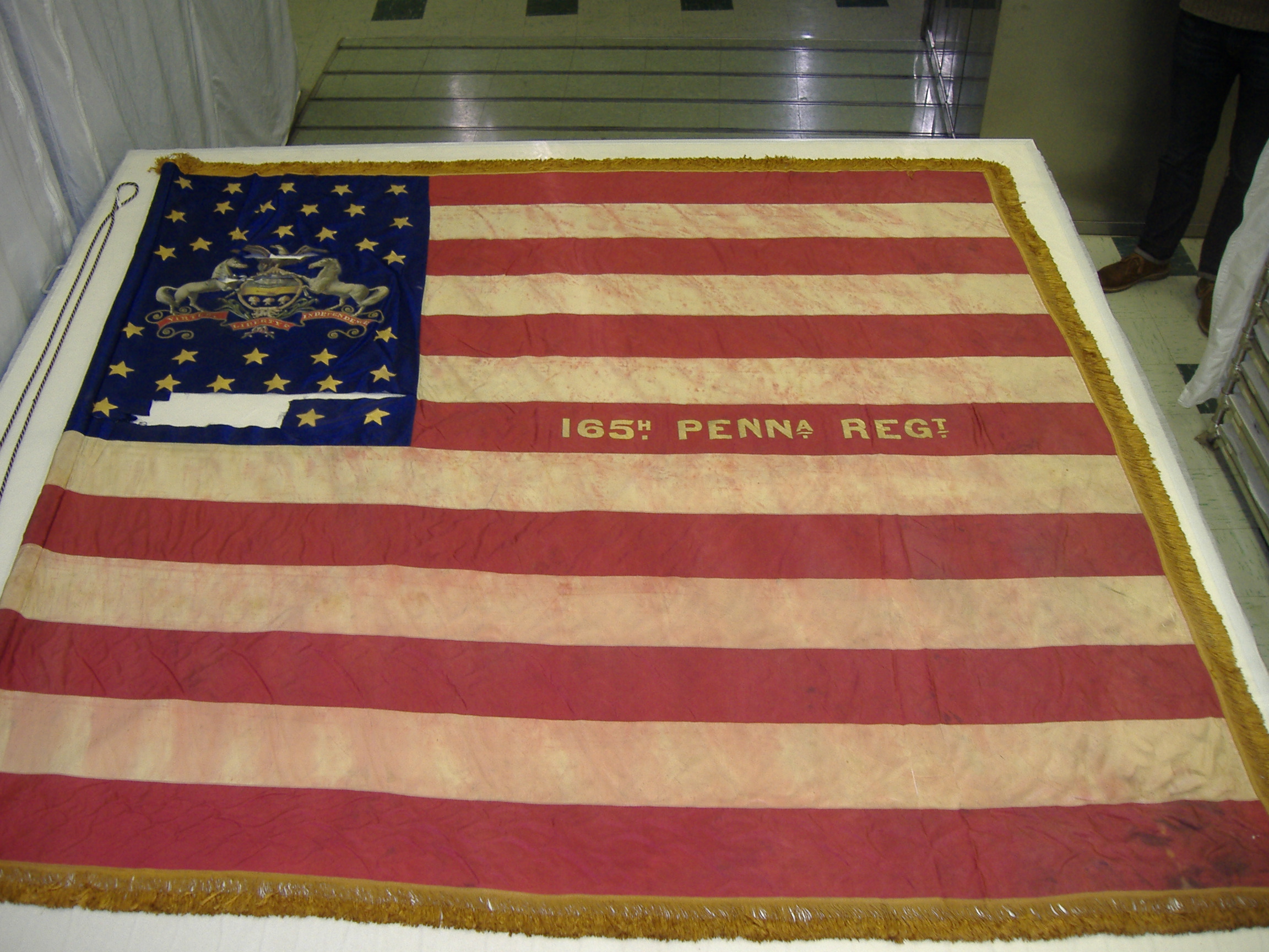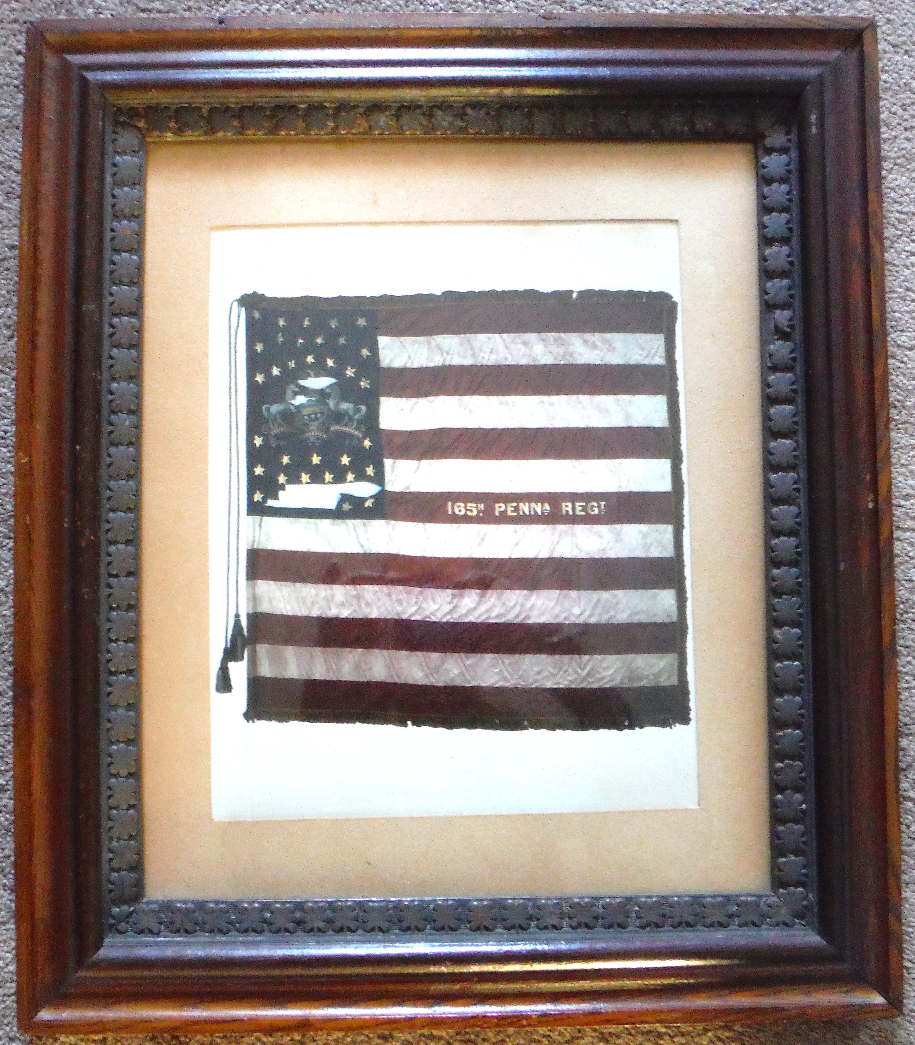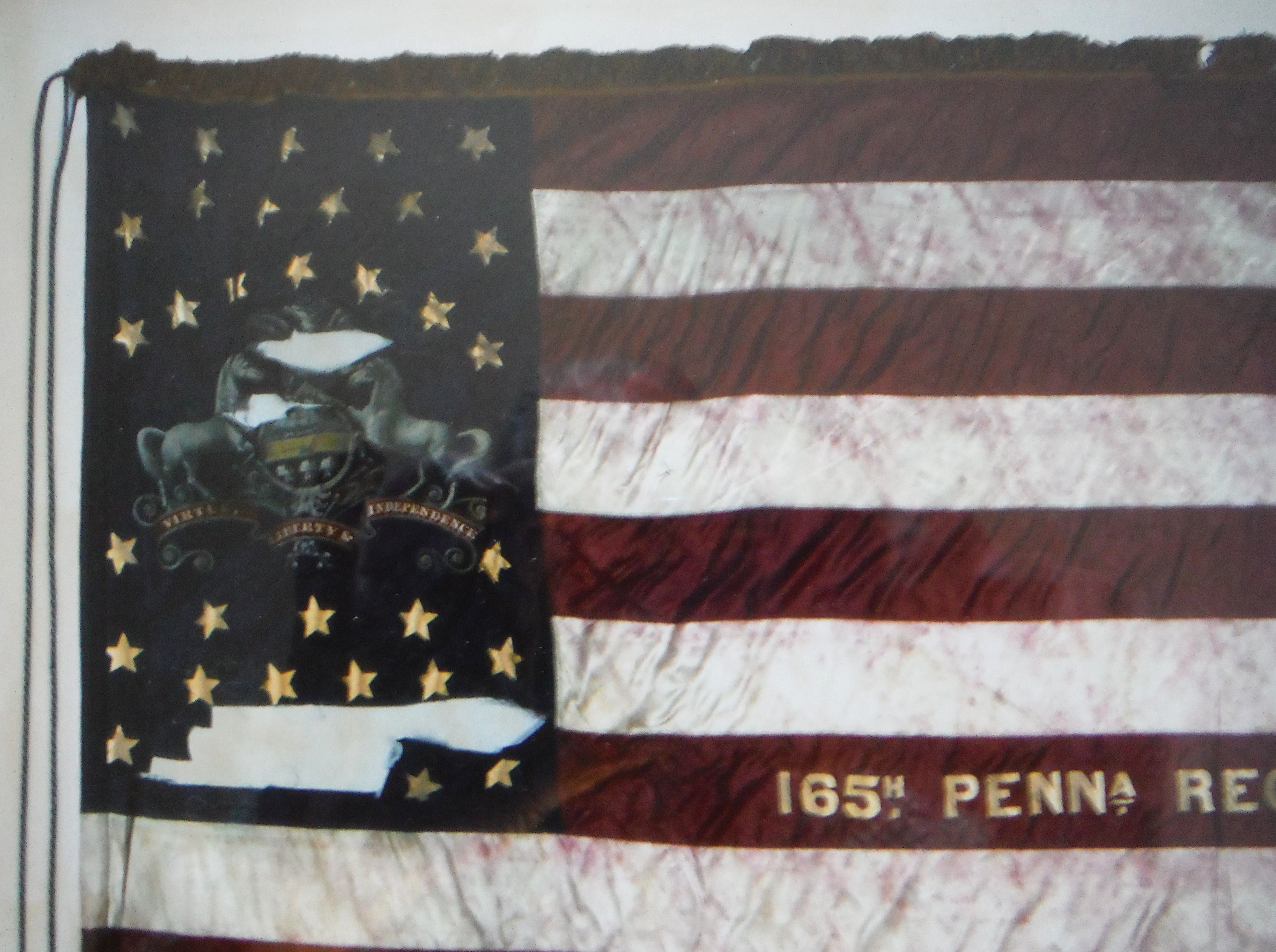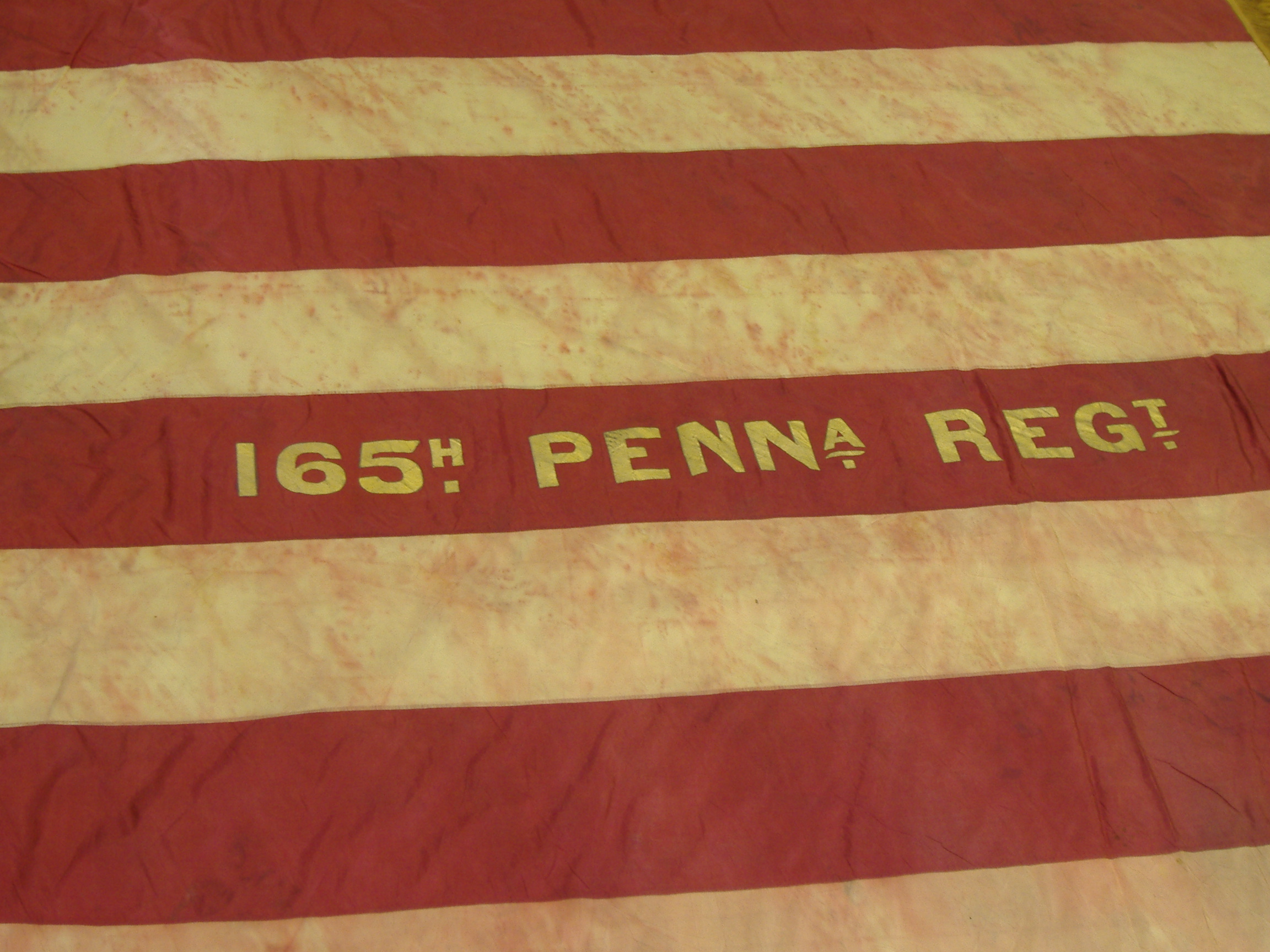 Remarkably, the original 165th Flag in this photograph still exists and is currently preserved in the Capital Preservation Committee Collection in Harrisburg, PA. Under these PA State Colors, the Bonneauville Boys served in President Lincoln's 1862-1863 drafted militia. The flag was manufactured by Horstman Co. of Philadelphia per a Dec. 9, 1862 order.