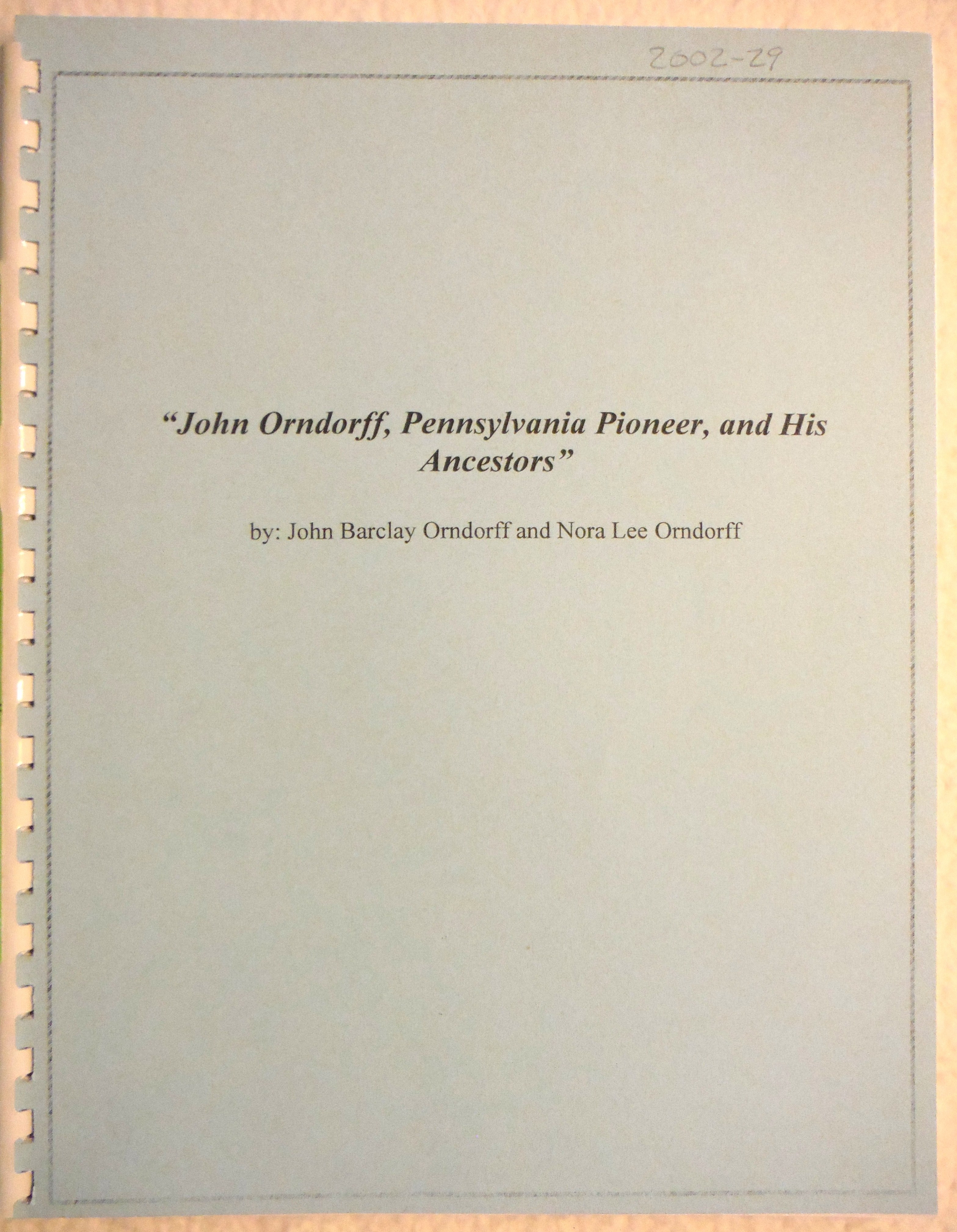 Pennsylvania State Library, Harrisburg, PA Catalogue notes: "John Orndorff, Pennsylvania Pioneer, and his ancestors: Johannes Peter Orndorff, John Orndorff junior, William Orndorff {and} John Orndorff. Compiled by John Barclay Orndorff, assisted by his daughter, Nora Lee Orndorff.