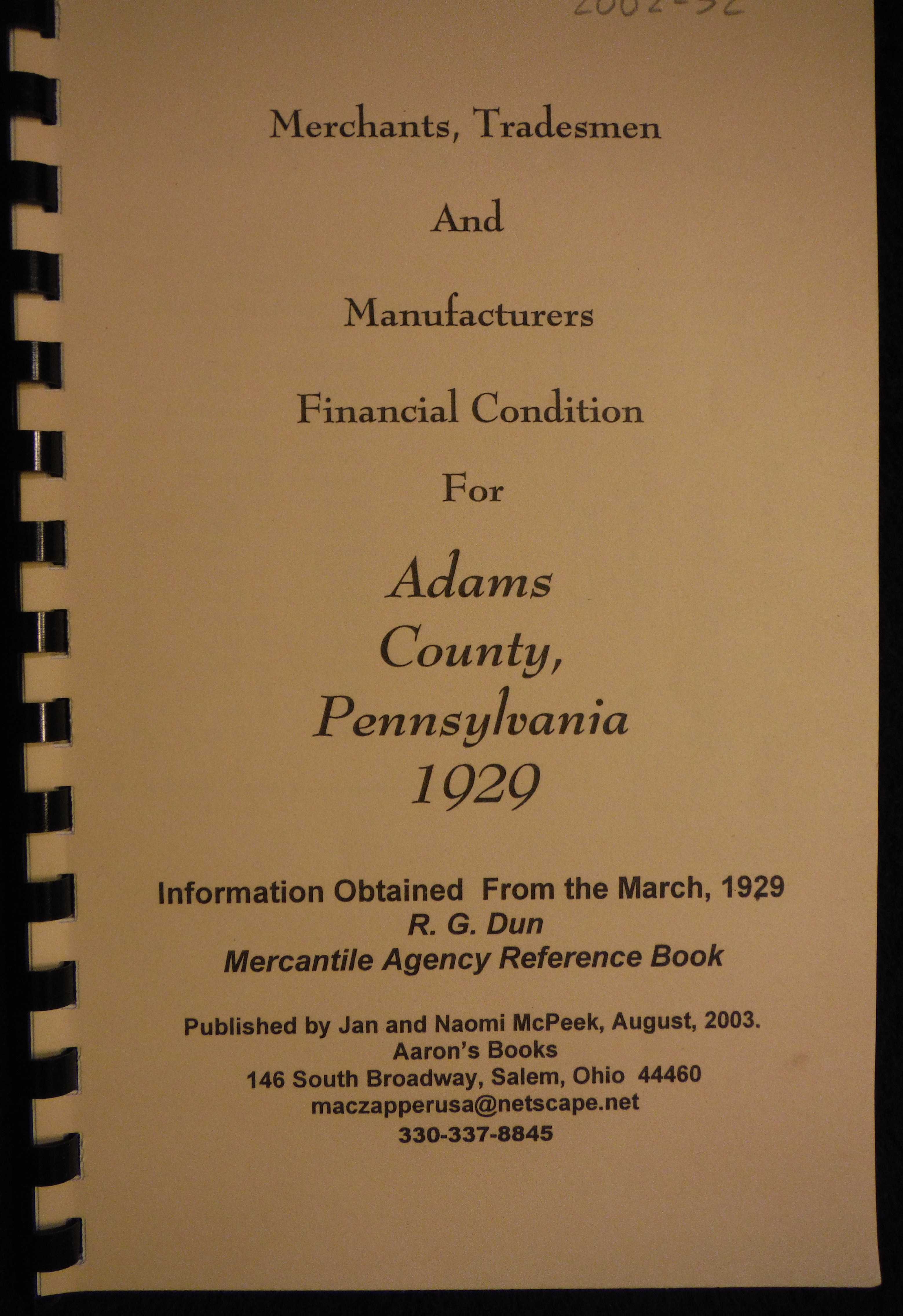 Reprinted copy; "Merchants, Tradesmen and Manufacturers Financial Condition for Adams County, Pennsylvania," 1929.