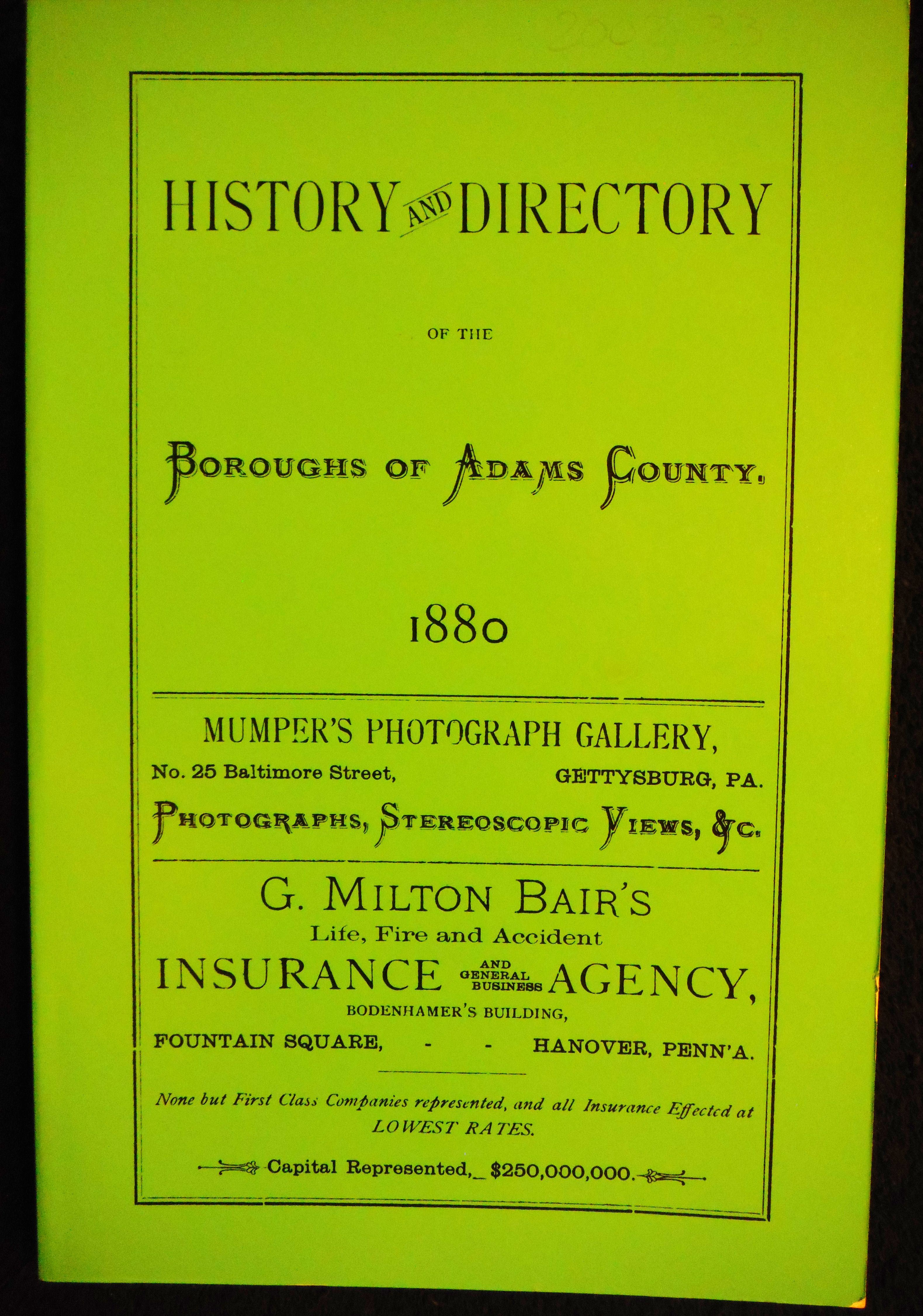 Reprint copy, 180 pages. History and Directory of the Boroughs of Gettysburg, Oxford, Littlestown, York Springs, Berwick, and East Berlin, Adams County, Pa: With Historical Collections (Google eBook)