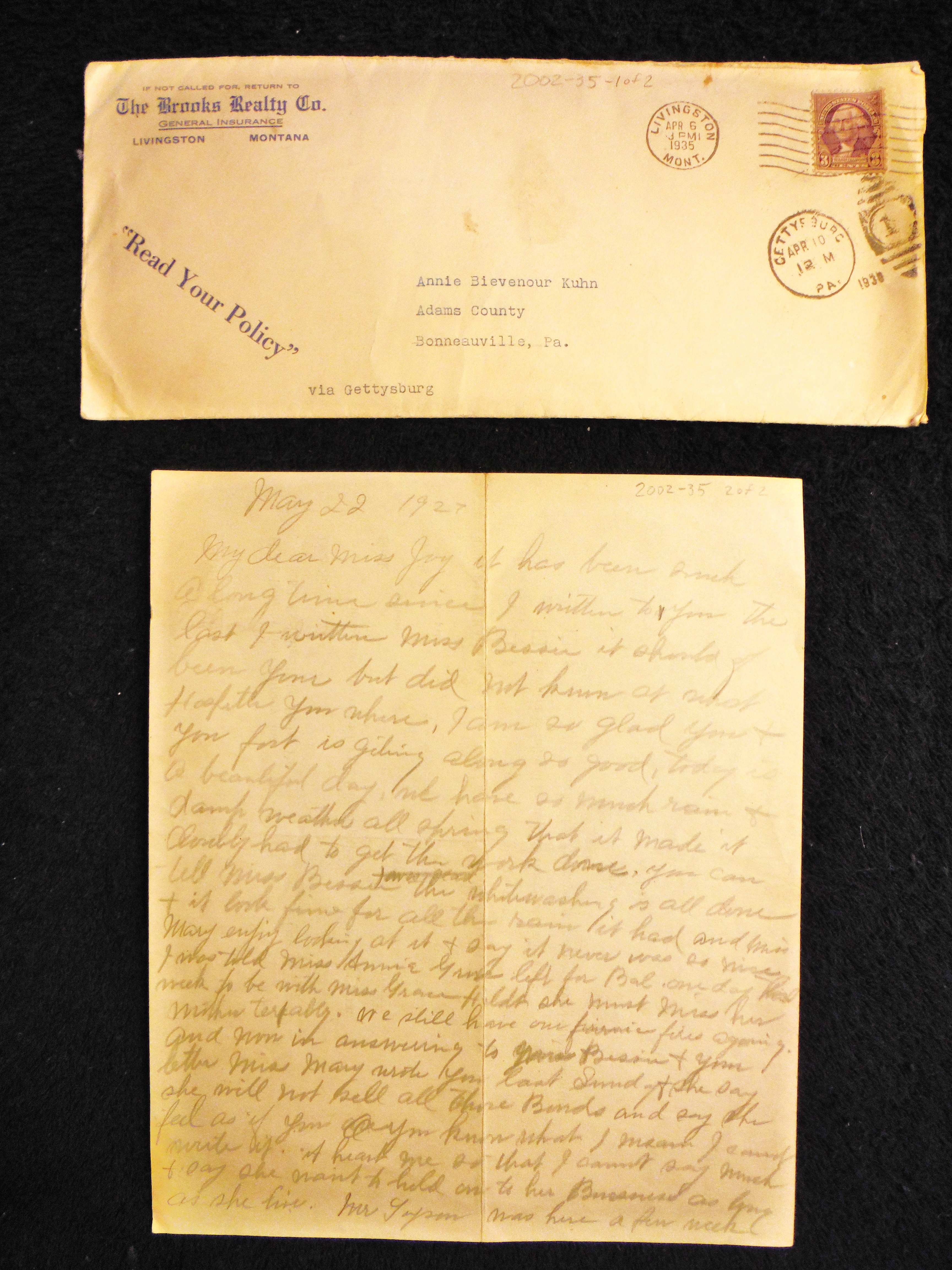 Envelope addressed to: Annie Bievenour Kuhn, Adams County, Bonneauville, PA. via Gettysburg. Brooks Realty Co., Livingston, Montana envelope. Postmarked; Livingston, 1935.