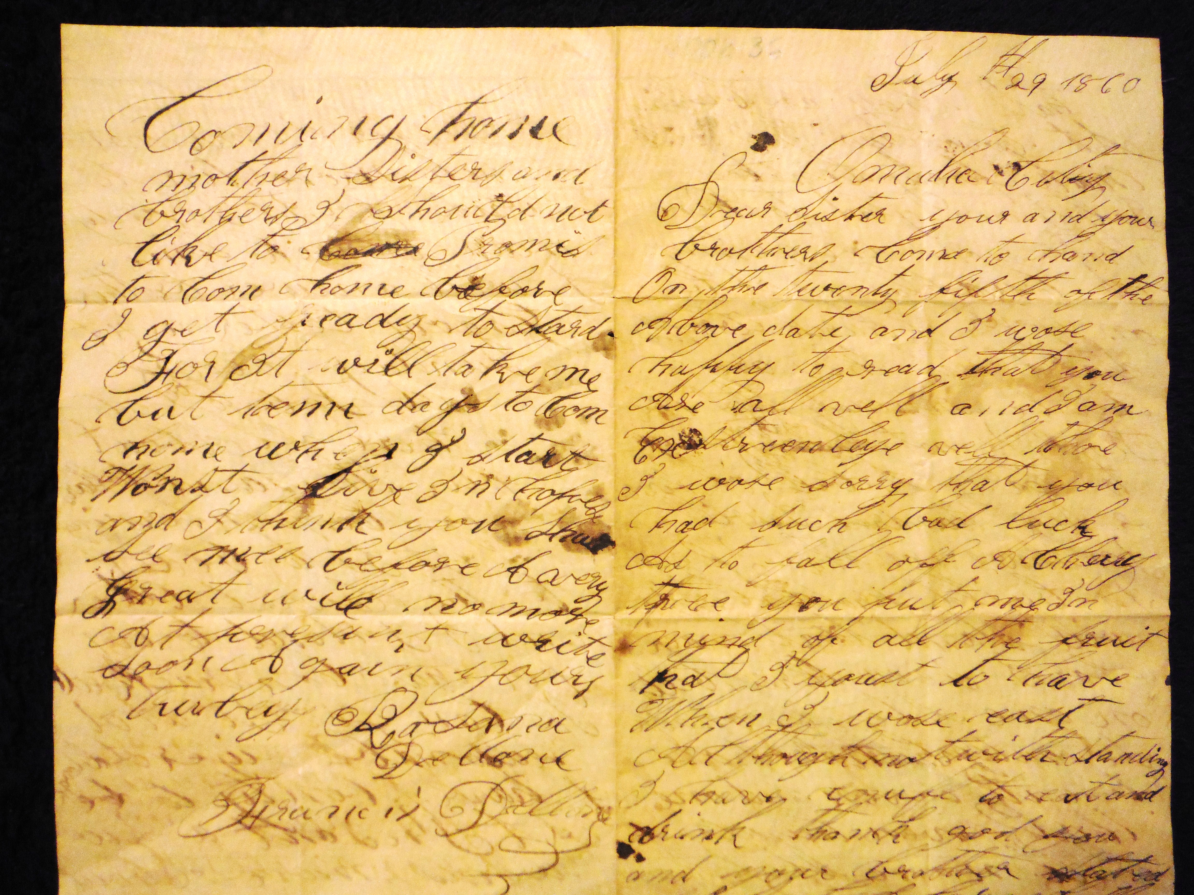 Written during a Civil War year, this July 29, 1860 letter is signed Francis Dellone. The writer primarily discusses a church bell, Conewago, coming home, and someone falling out of a cherry tree.