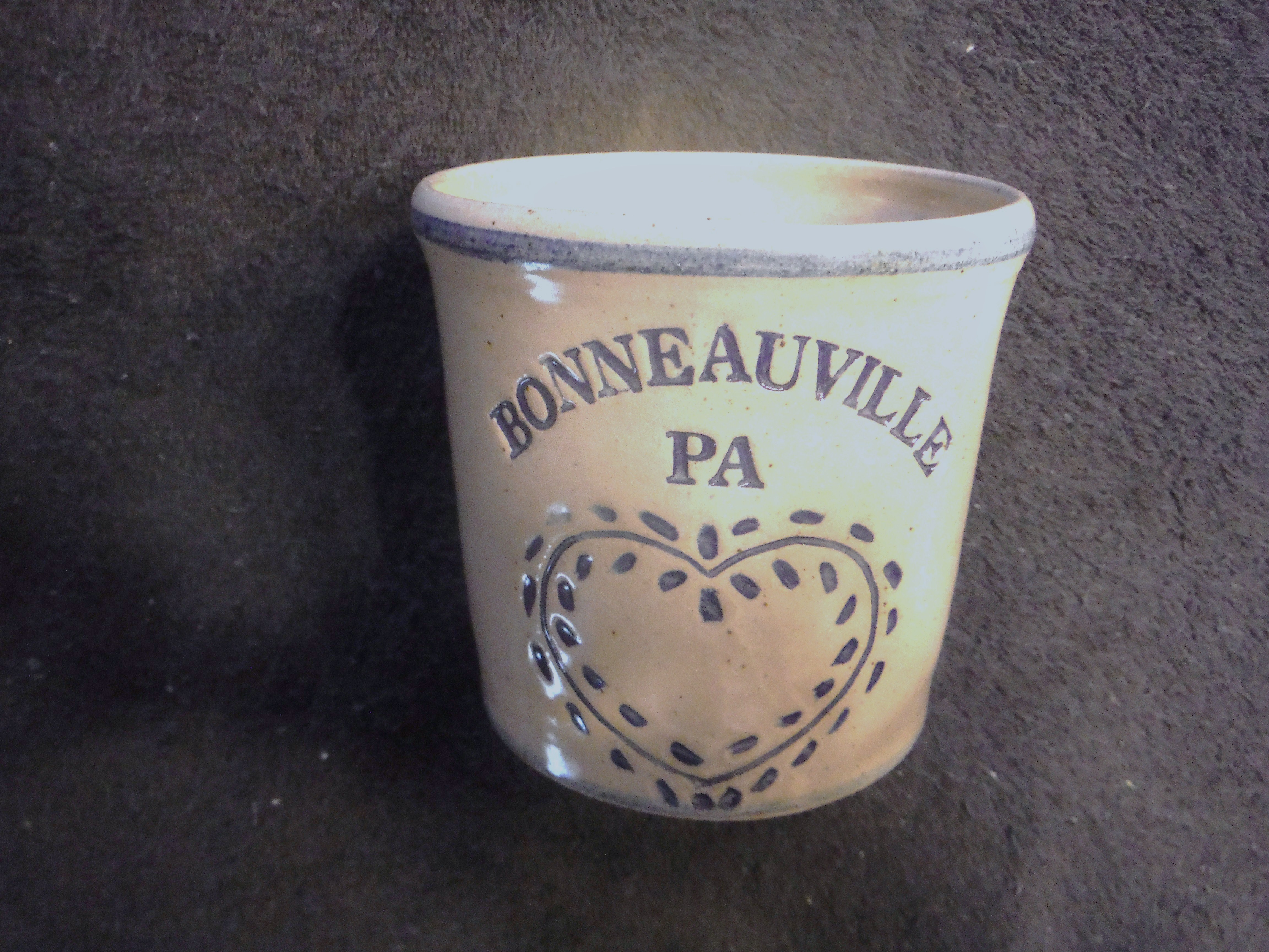 Small grey glazed stoneware crock signed; "Keaton, 2002." Hand thrown. Stamp impressed "Bonneauville, PA," with organic heart decoration. Impressions filled with cobalt blue colored glaze.