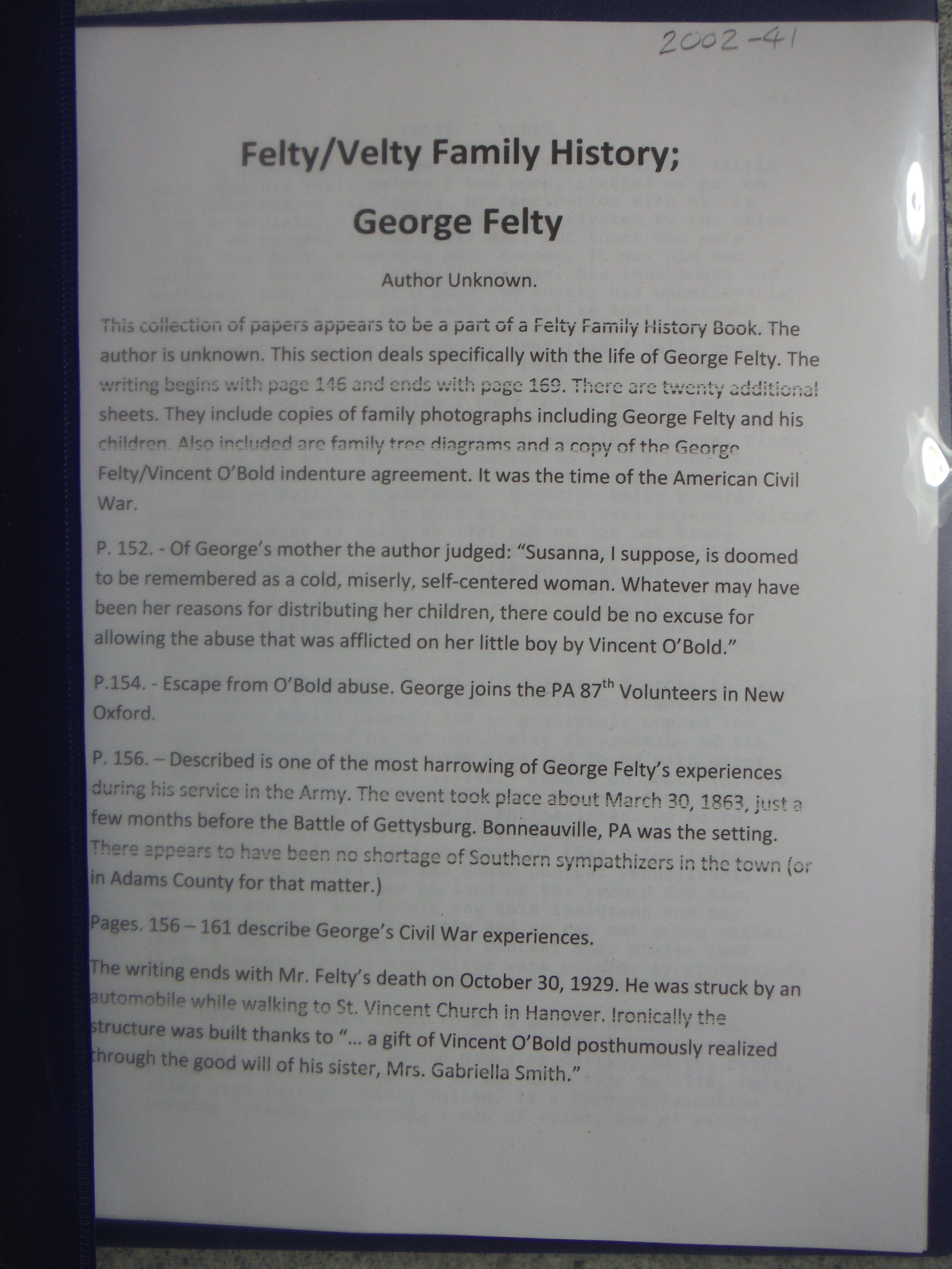 The writing ends with Mr. Felty's death on October 30, 1929. He was struck by an automobile while walking to St. Vincent Church in Hanover. Ironically the structure was built thanks to "