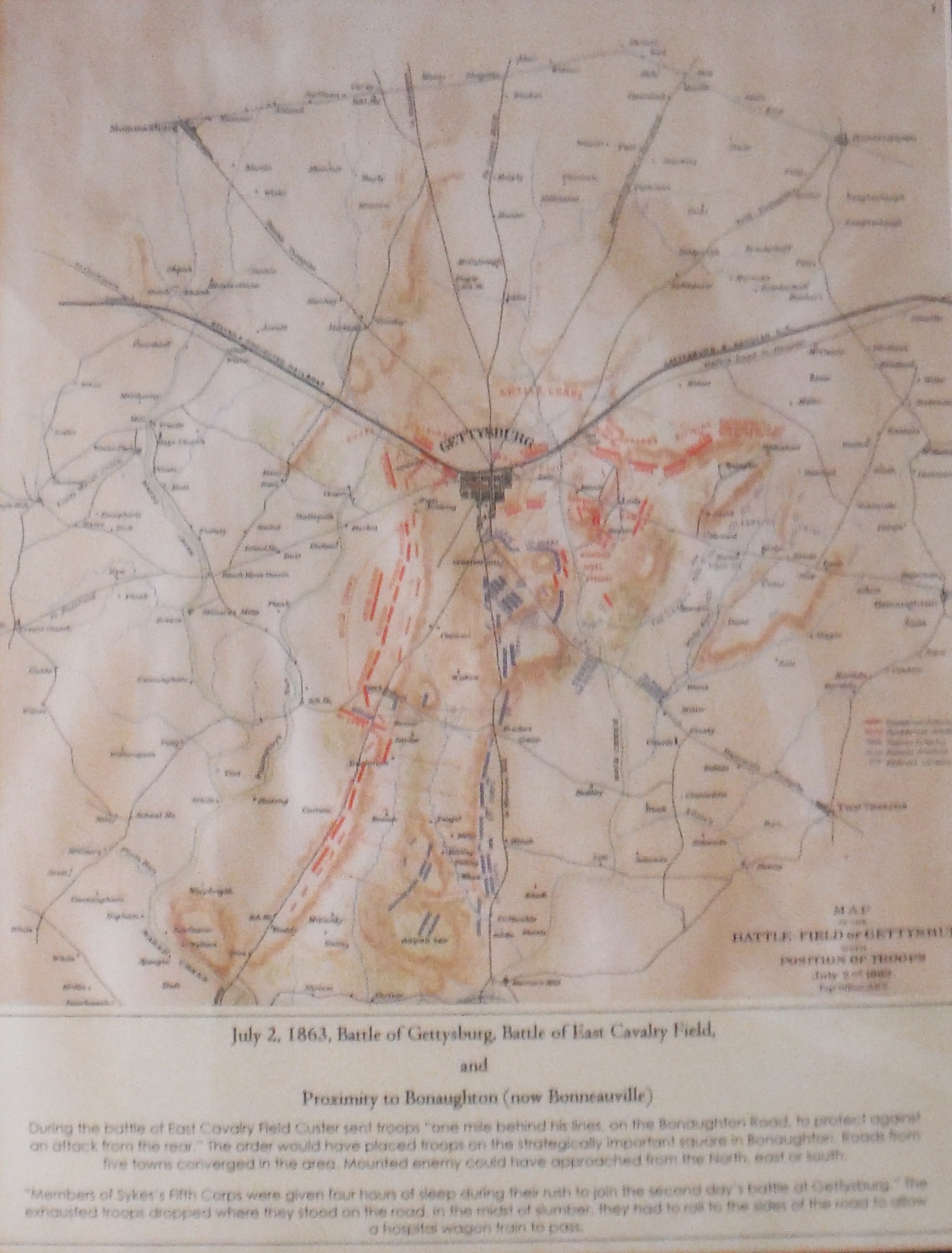 During the battle, Gen. Custer positioned some of his mounted troops one mile to the rear of the battle on the Hanover Road. That would have placed the troops about on the square in Bonneauville. Logically it would have been the most strategic place to have rear guard soldiers. From there the enemy could have approached Custer's rear from the north, east, or south on five different roads: Hunterstown, New Oxford, Hanover, Littlestown and Two Taverns. All could have been observed from the area of the Bonneauville square.