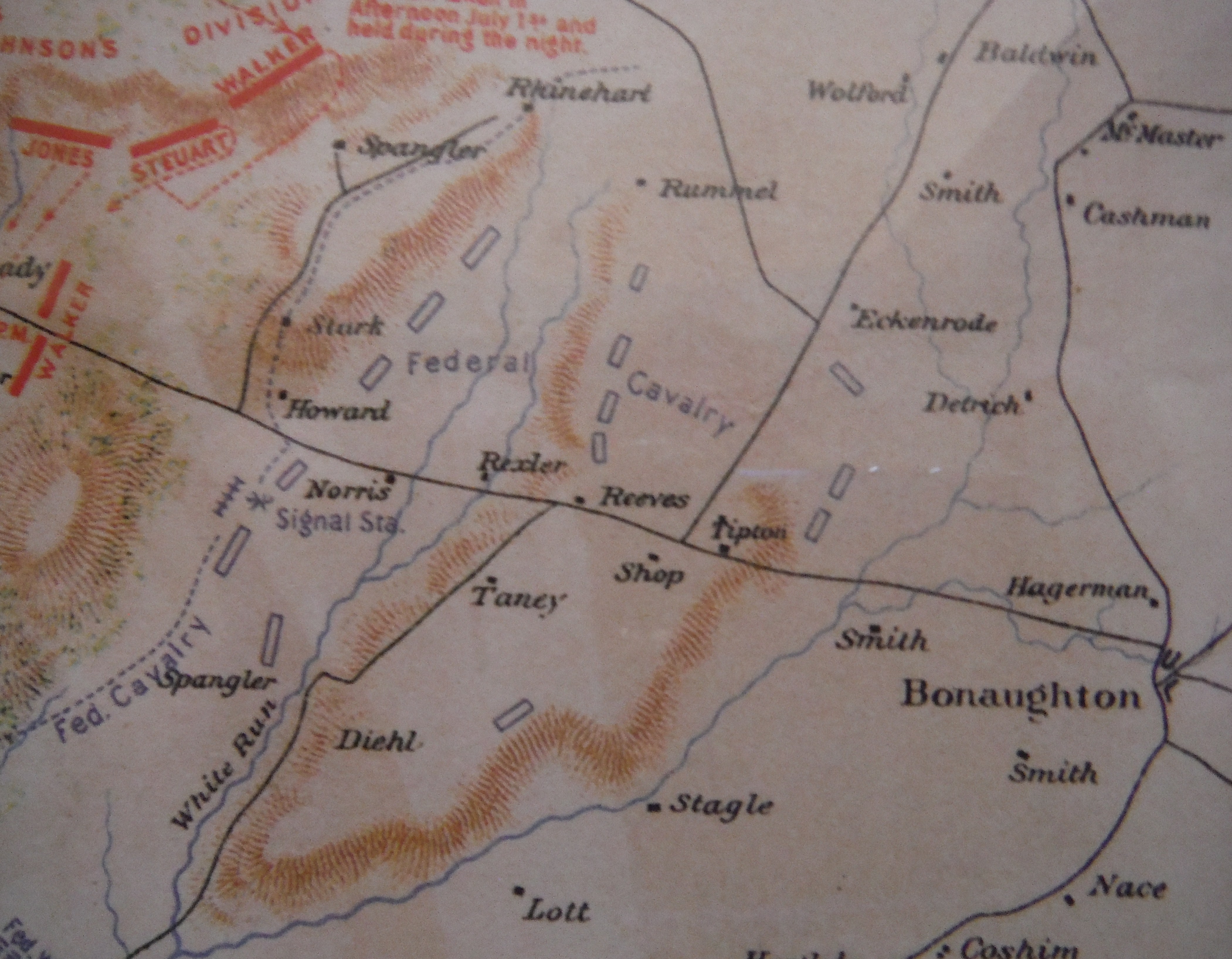 This is one of the few Gettysburg Battle maps that includes Bonaughton (Bonneauville). The position of General Custer's troops is shown west of the town. The Low Dutch road from Rt. 116 to the south appears to be missing from the map. Some Civil War authors have therorized that the intersection was the objective of the Battle of East Cavalry Field. The road omission error indicates that that may not have been the case.