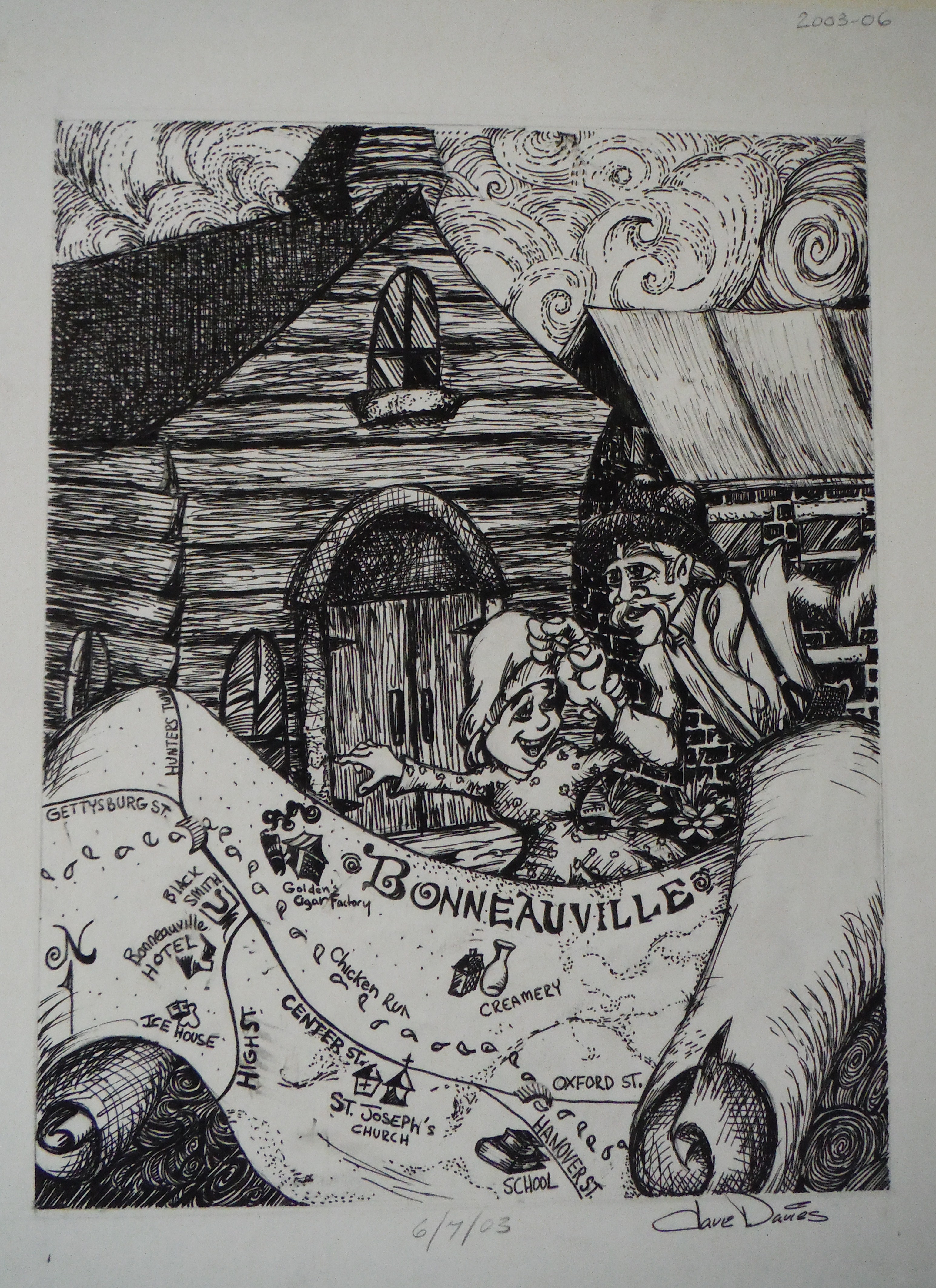 This piece was created by Dave Davies of Gettysburg, PA for use in the book; "Bonneauville History and Lore." The lively caricature depicts a father and daughter near the square in Bonneauville. The background represents St. Joseph's Church when the building was still sided with wood. The brick parsonage stands to the right. A scrolled map highlights early Bonneauville features.