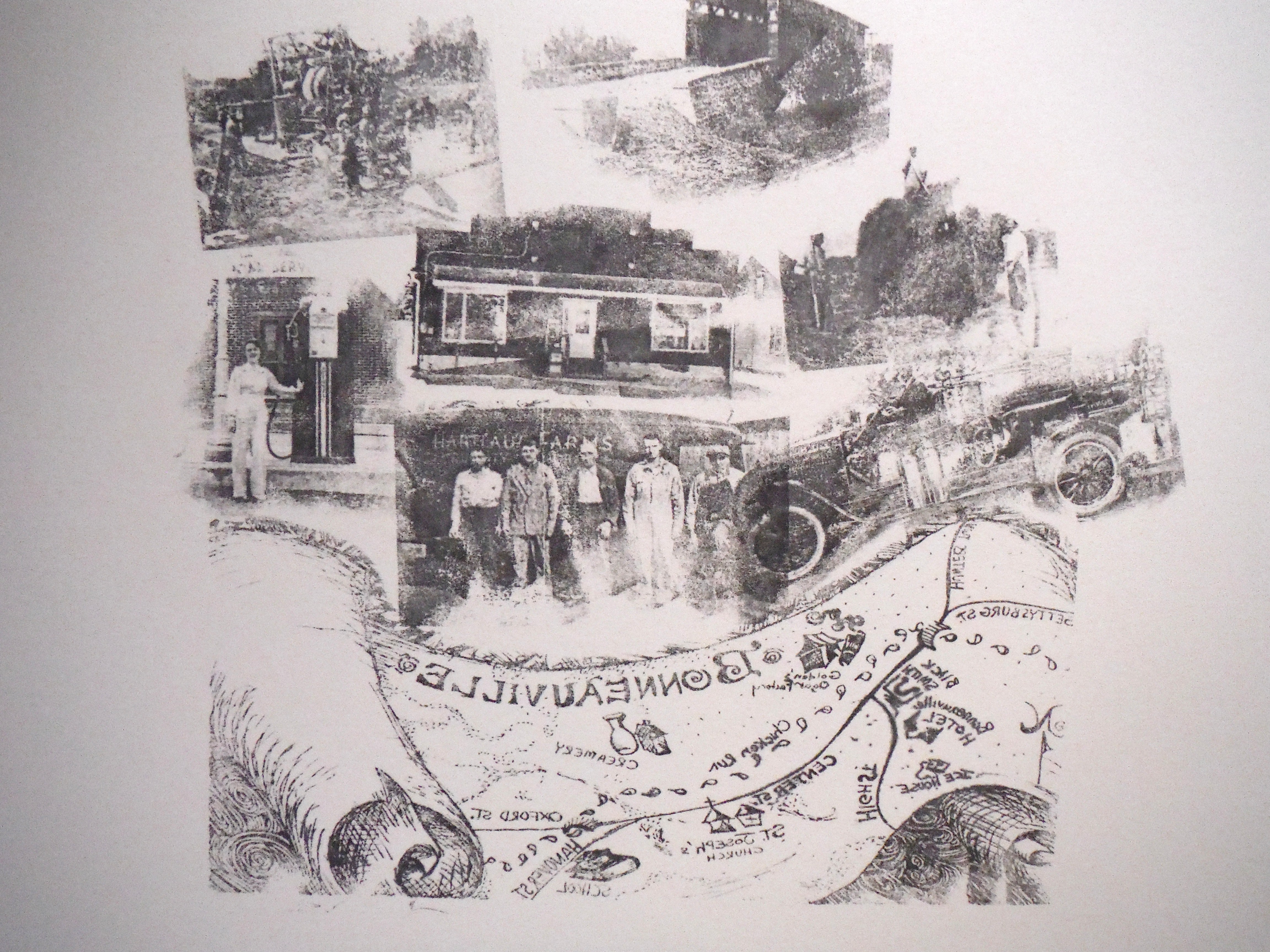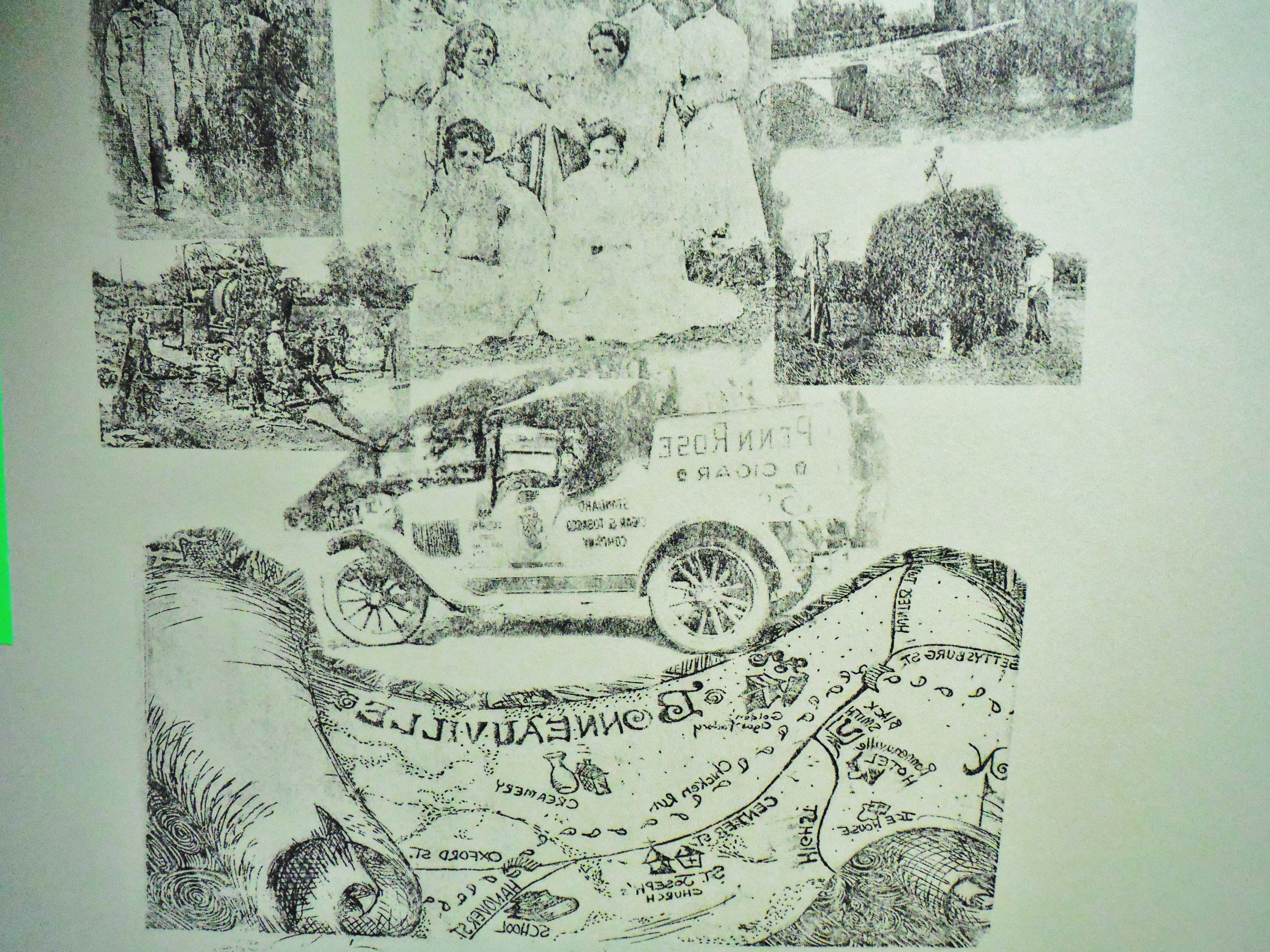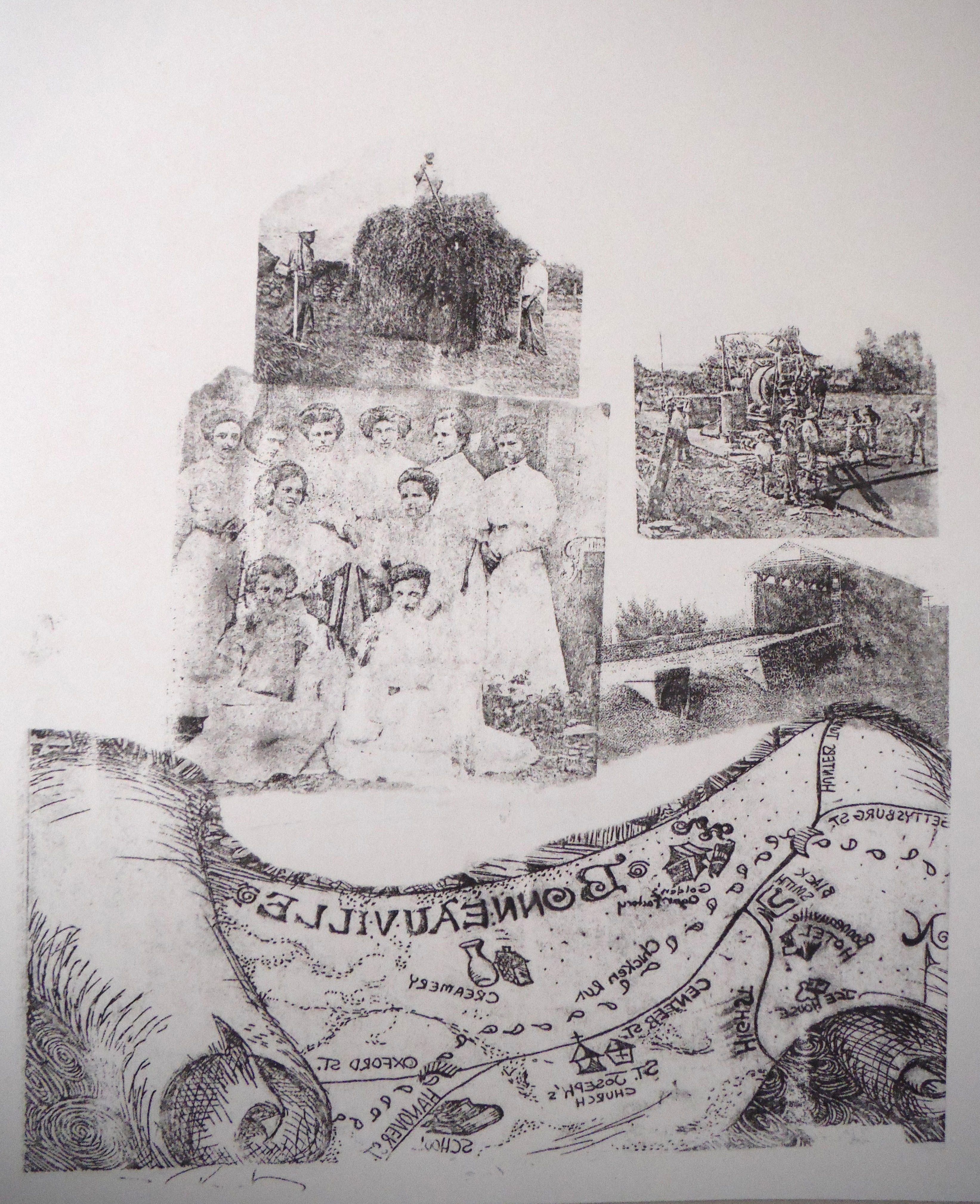 This is the original four sheet cover art study for the first edition of "Bonneauville History and Lore." Mrs. Wolf explored the culture of Bonneauville through old photographs provided by some of the individuals interviewed for the book.