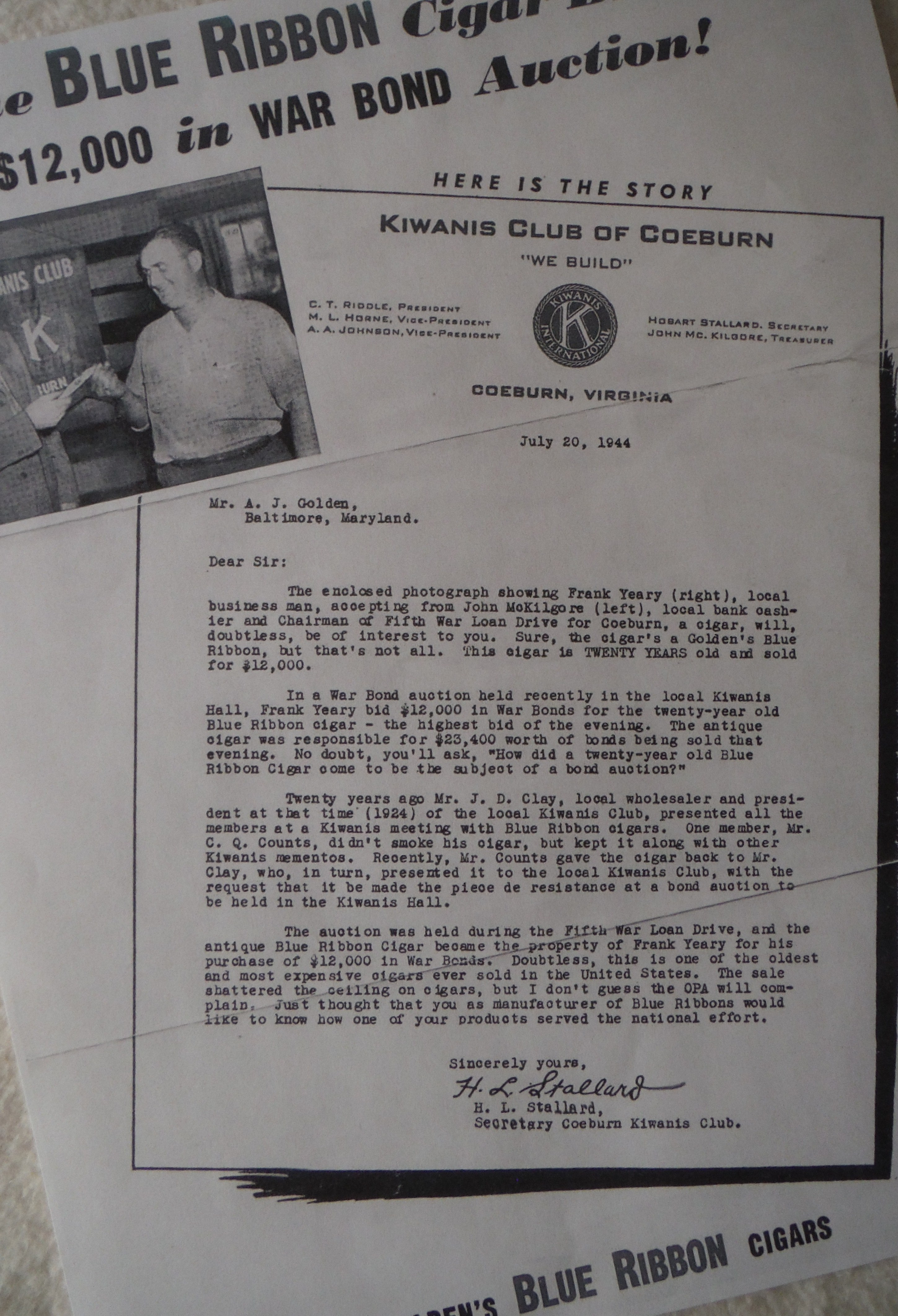 This letter to Mr. A. J. Golden describes how one Blue Ribbon Cigar sold for $12,000.00 at a US War Bond Auction in 1944. The letter is dated July 20, 1944 and signed by H. L. Stallard, Secretary Coeburn (VA) Kiwanis Club. Names mentioned include: C. T. Riddle, N. L. Horne, A. A. Johnson, Hobart Stallard, John McKilgore, Frank Yeary, J. D. Clay, and C. Q. Counts.