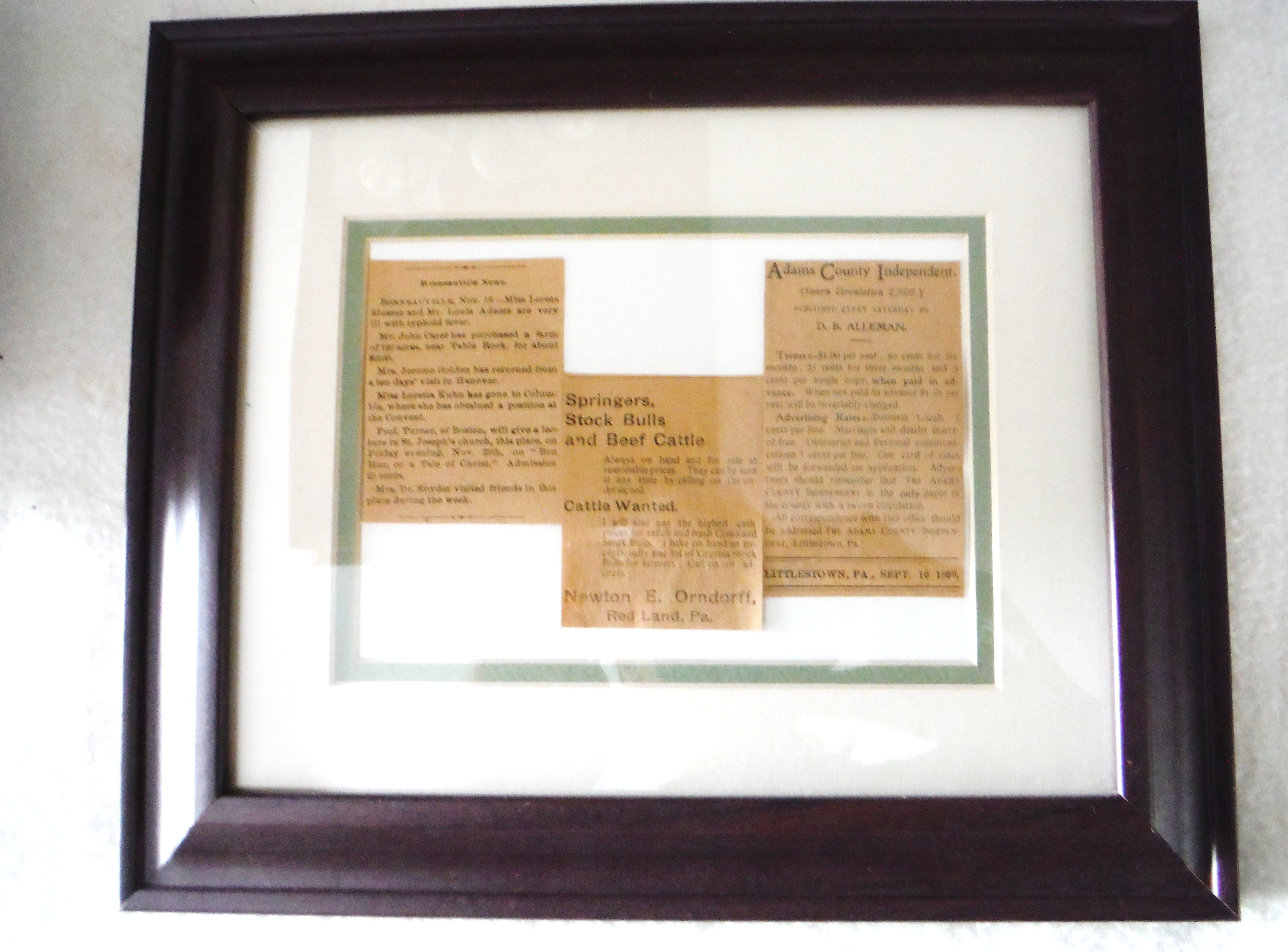 Three Adams County Independent Newspaper articles (Littlestown, PA. 1898) framed.