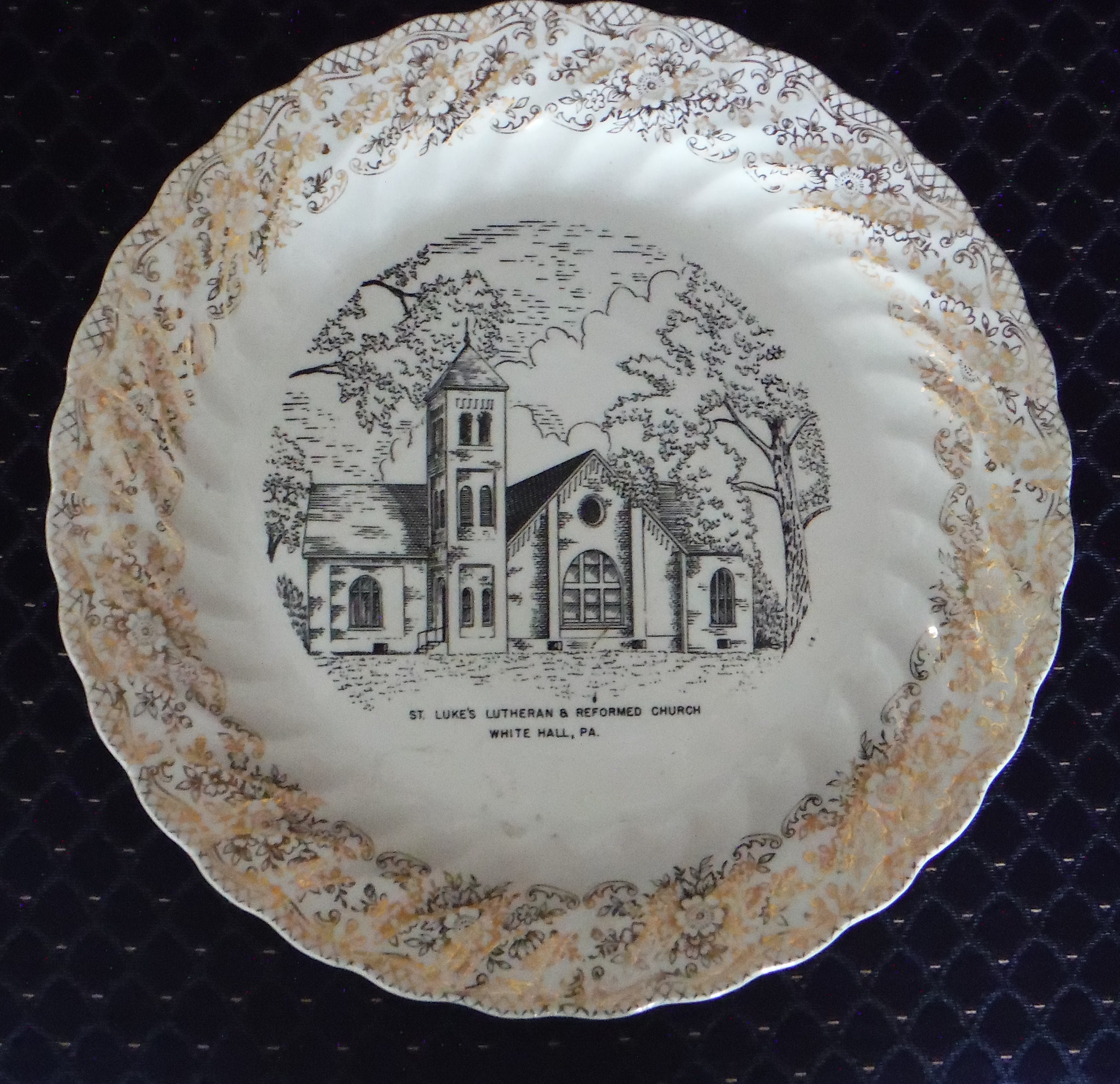 This decorative plate Commemorates St. Luke's Luthern and Reformed Church, White Hall, PA. The church stands alone, in a woodlot, just outside of Bonneauville on the Littlestown Road.