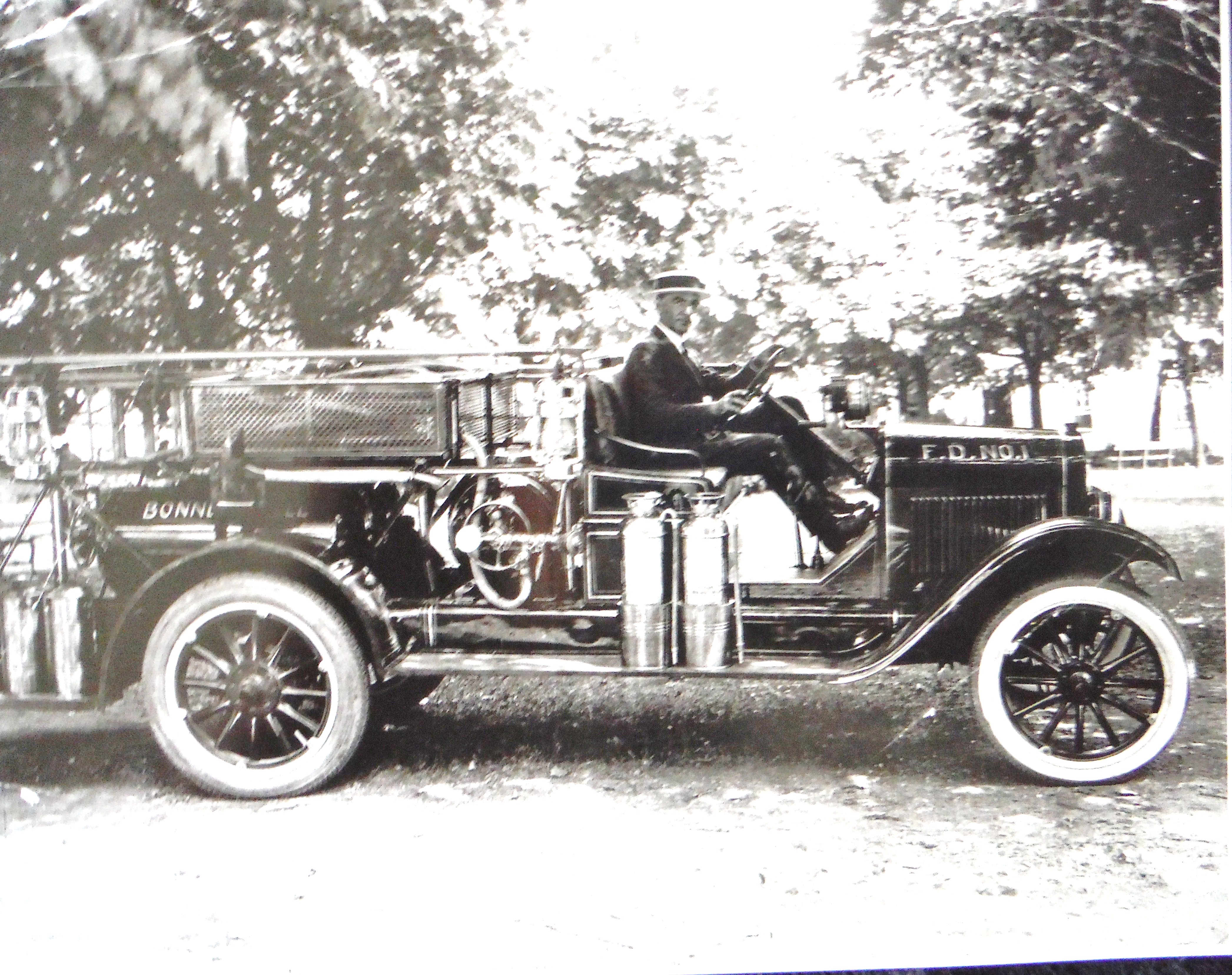 Businessman Austin Neiderer arranged the purchase of Bonneauville Fire Company's first fire truck - a Chevrolet. Here he poses with the gleaming new machine. The truck is gold leaf lettered with the text "Bonneauville and F. D. No 1."