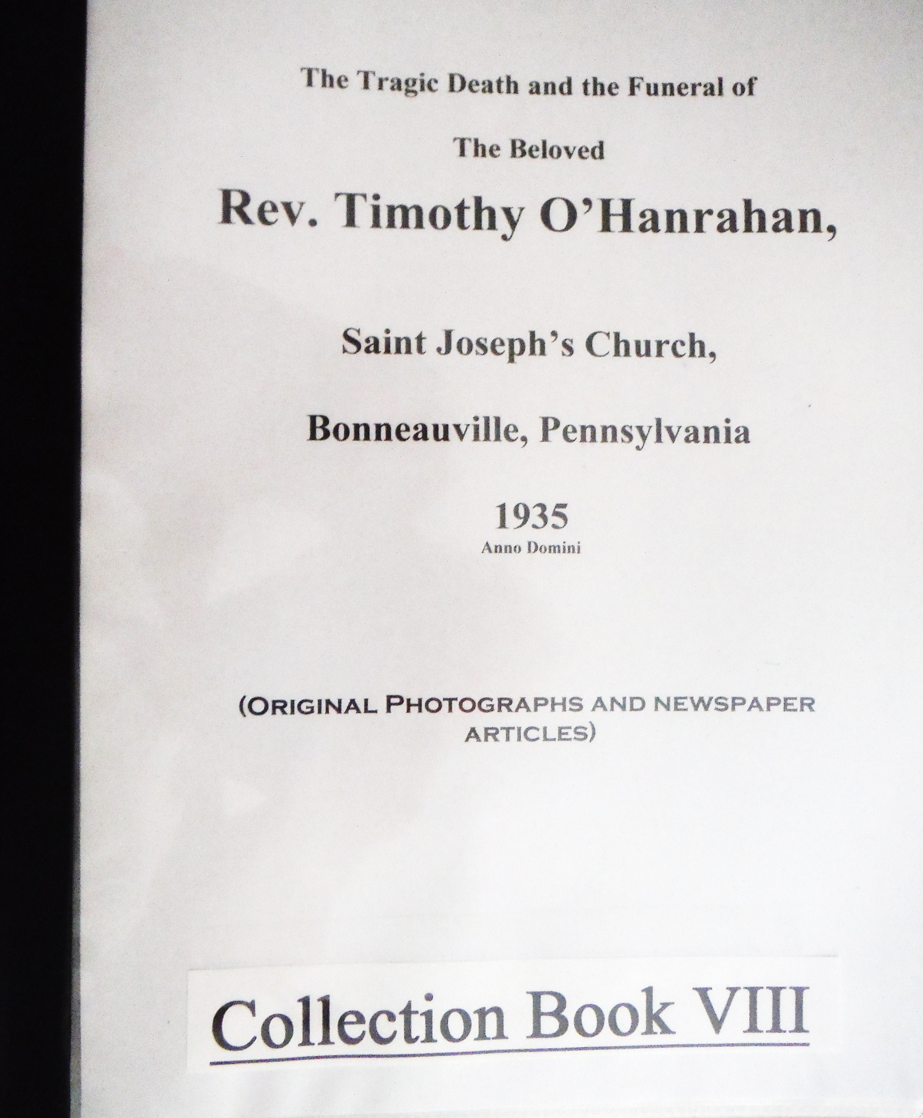 Fr. O'Hanrahan was well liked by the parishioners at St. Joseph's Catholic Church in Bonneauville, PA. In 1935 he died in an automobile accident while traveling to Philadelphia with fellow priests, for the coronation of Bishop Newman. Compiled in this binder are newspaper articles and photos. Also included are eleven original photographs of his funeral services.