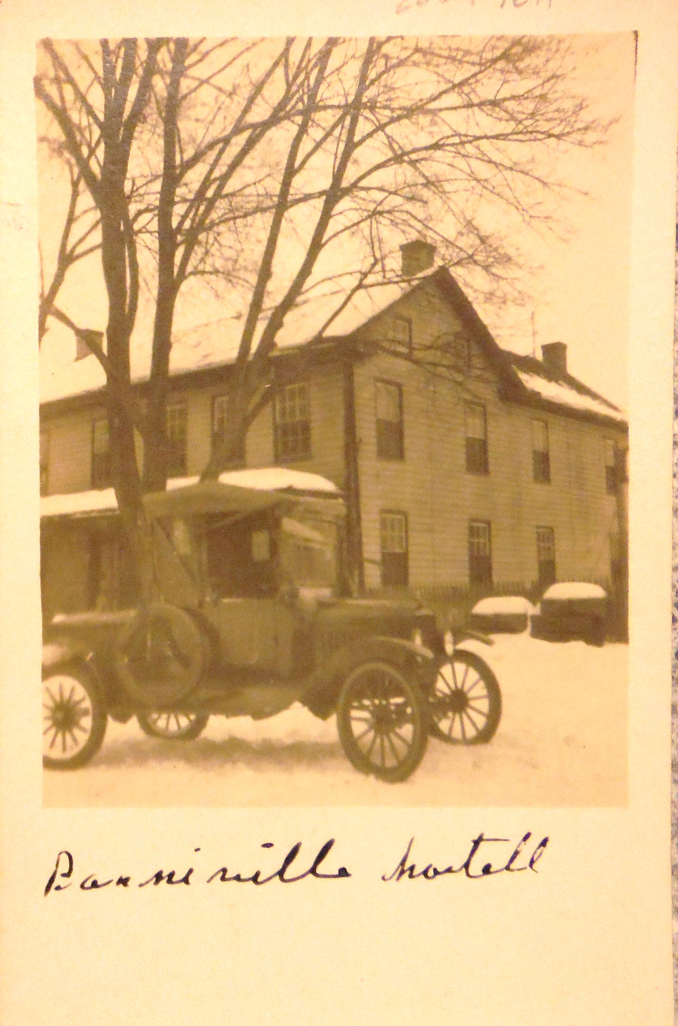 A Model "T" Ford truck is parked at the snow covered Village Square, (about 1918). Background; the Bonneauville Hotel on Maple Street. The clapboard siding of this hotel conceals a structure that was built of logs in the 18th Century.
