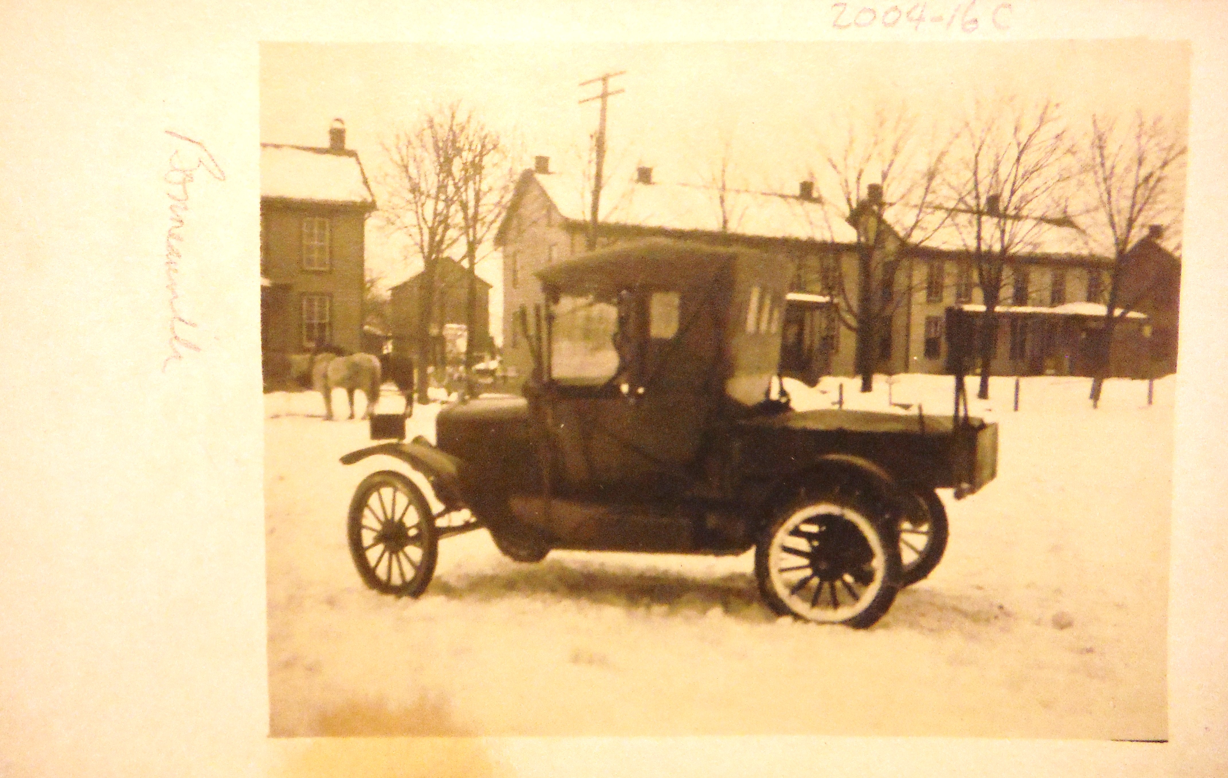 A Model "T" Ford truck is parked at the snow covered Village Square (about 1918). The homes and stores on the north side of the first block of East Hanover Street. Background at left; two horses tied in front of the general store.