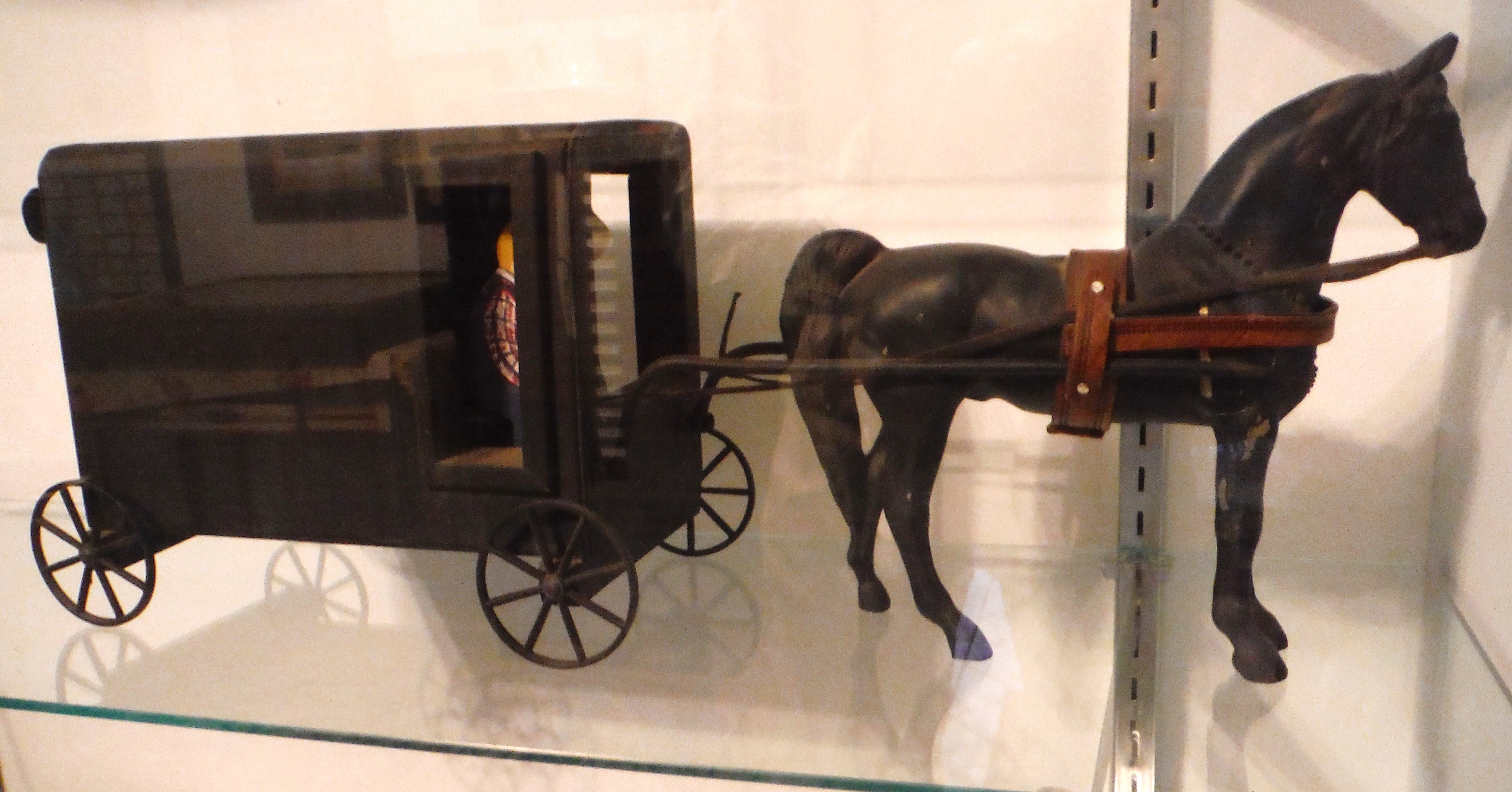 Mr. Staub liked to create folkart pieces from repurposed items found at auctions or wherever else he could acquire them. The horse in this horse and buggy piece was once a cast metal stand-alone figure. The Amish wagon was made from wood scraps and neatly covered with black vinyl. The Amish couple were sawn from scrap wood and painted. The under-scale wheels were likely from a toy that was no longer serviceable.