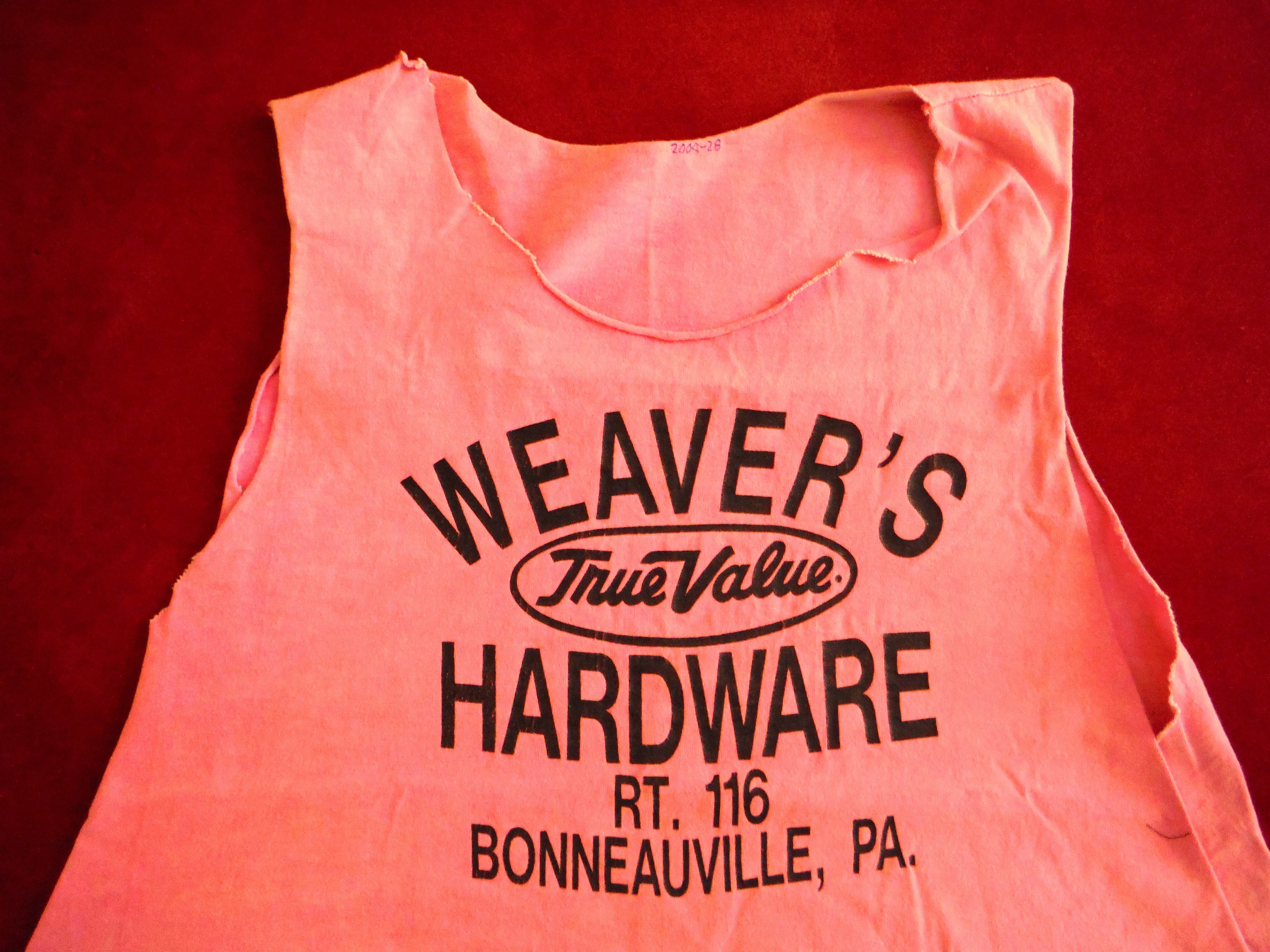 This t-shirt advertises; "Weaver's True Value Hardware, Rt 116, Bonneauville, PA." For a time in the 1990's it was fashionable for youngsters to rip the sleeves and collar from their t-shirts. The result was the then popular "Grunge Look." Thus the condition of this shirt. Pink shirt, Black text.