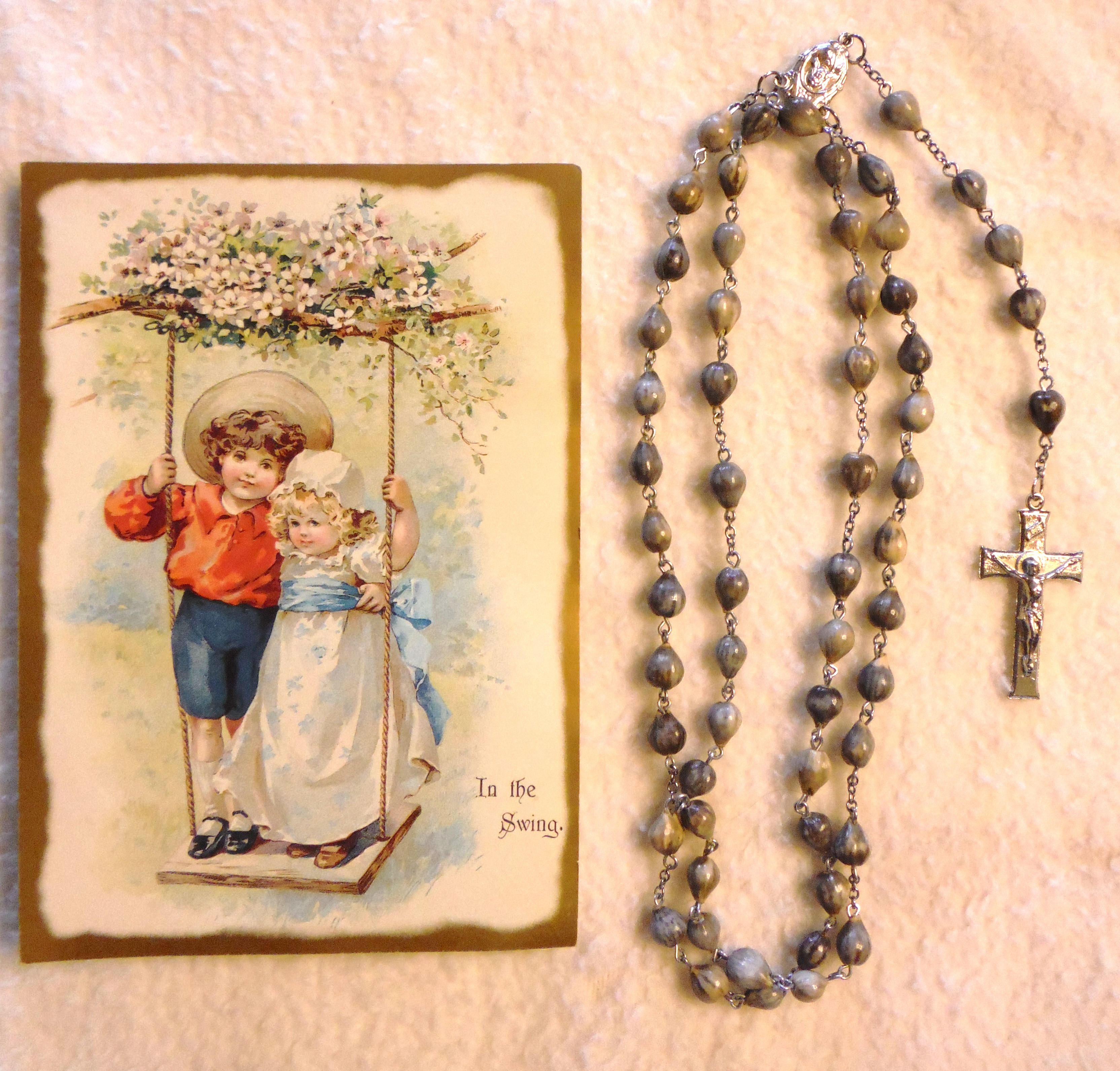 Attached note; "Jobes Tears! Grown by Ben Klunk, Rosaries made by Marie Klunk." Attached card; "In the Swing."