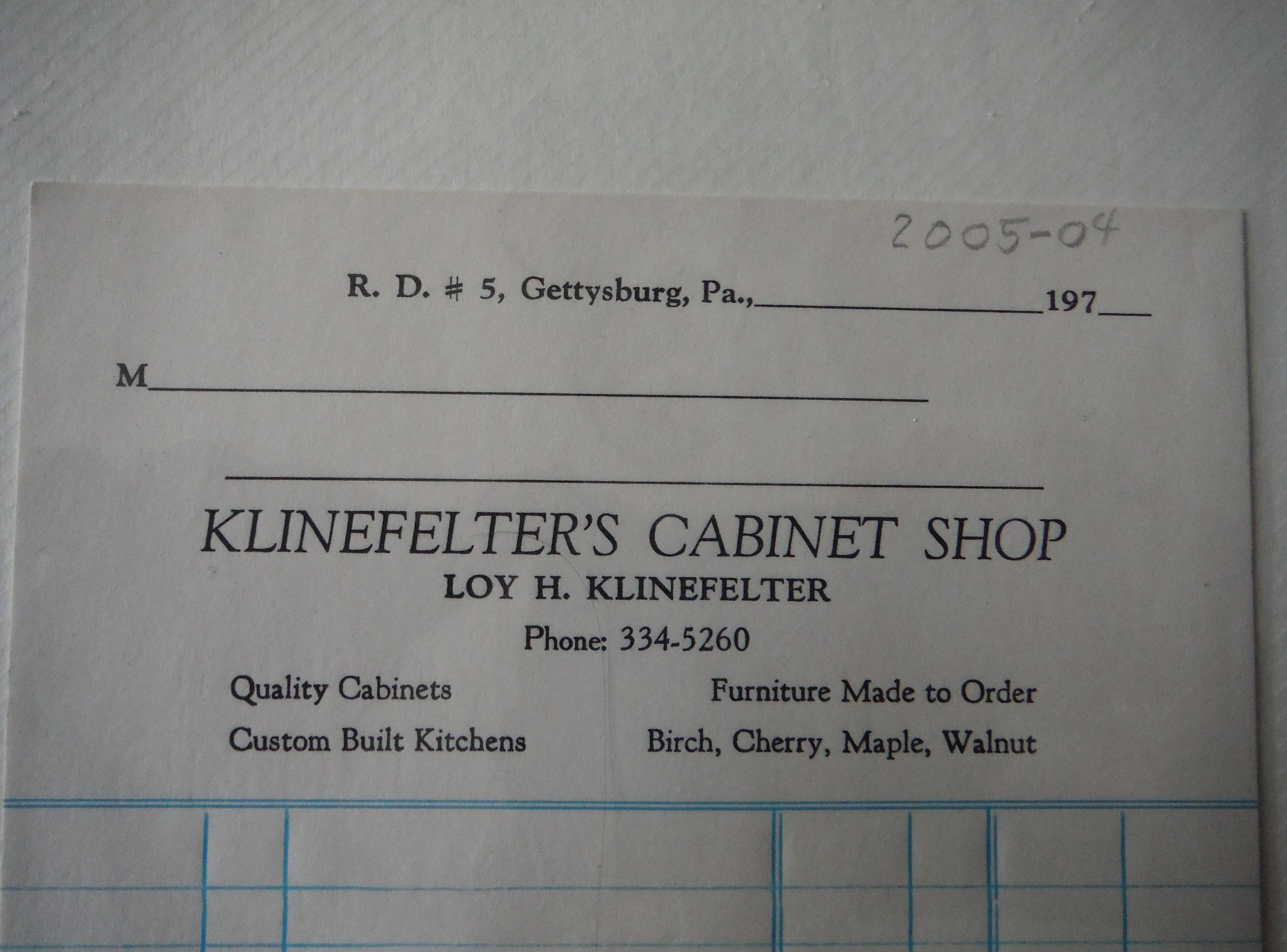 Loy H. Klinefelter lived just outside the boundaries of the Bonneauville Borough on the Two Tavern Road. There he operated a cabinet shop where he primarily fabricated kitchen cabinets - hundreds of sets over his career.