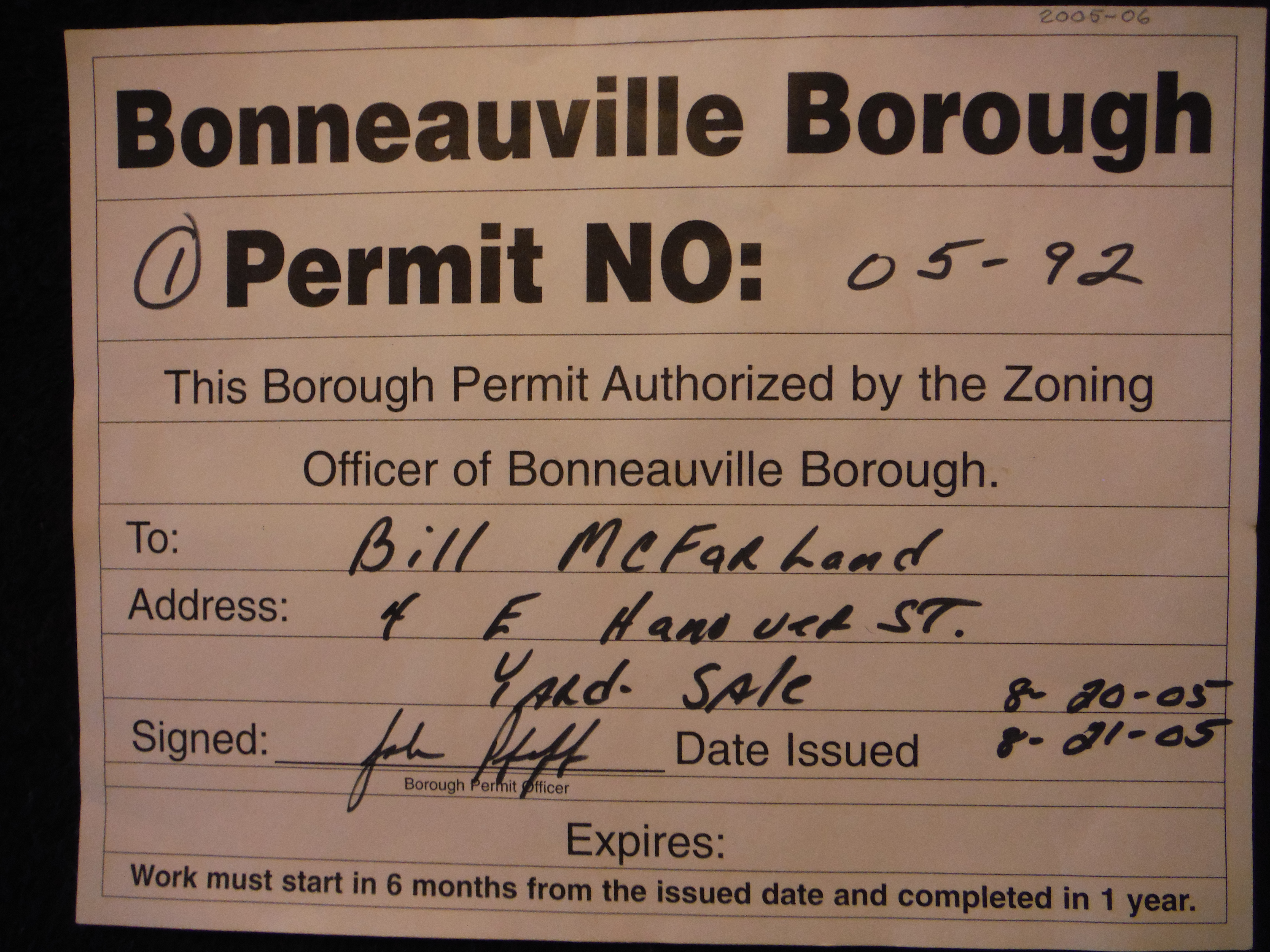 Yard sale permit for Bill McFarland, 4 E. Hanover St. May, 2005. Mr. and Mrs. McFarland live at 4 E. Hanover Street, on the square in Bonneauville. In the basement crawl space of the McFarland house can be found the stone foundation for Squire Brinkerhoff's log school. The structure was built in the 18th Century.