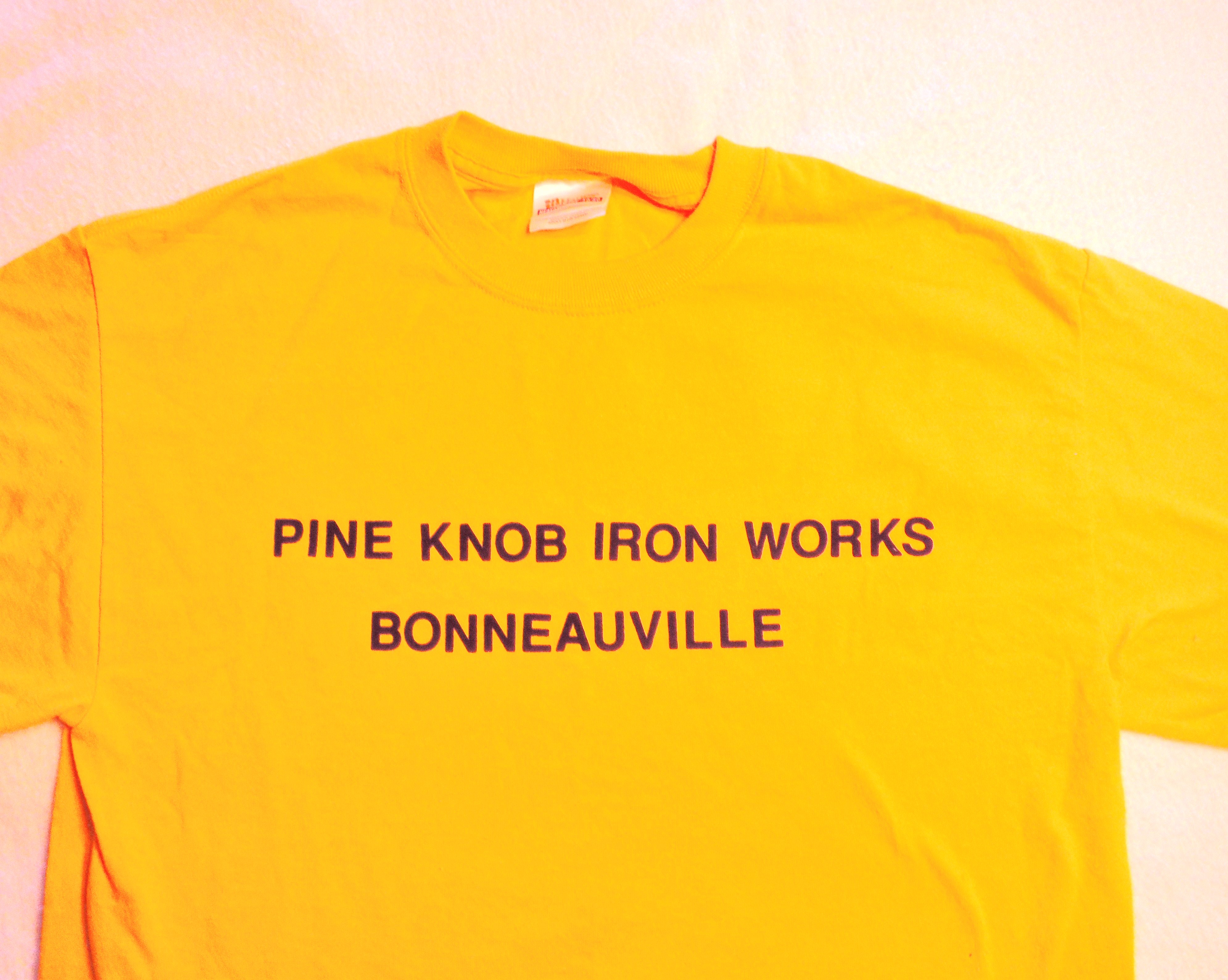 This shirt advertises "Pine Knob Iron Works, Bonneauville." The business, a blacksmith shop, is located at 4A Locust Street. Karl Orndorff proprietor. Yellow shirt, blue text.