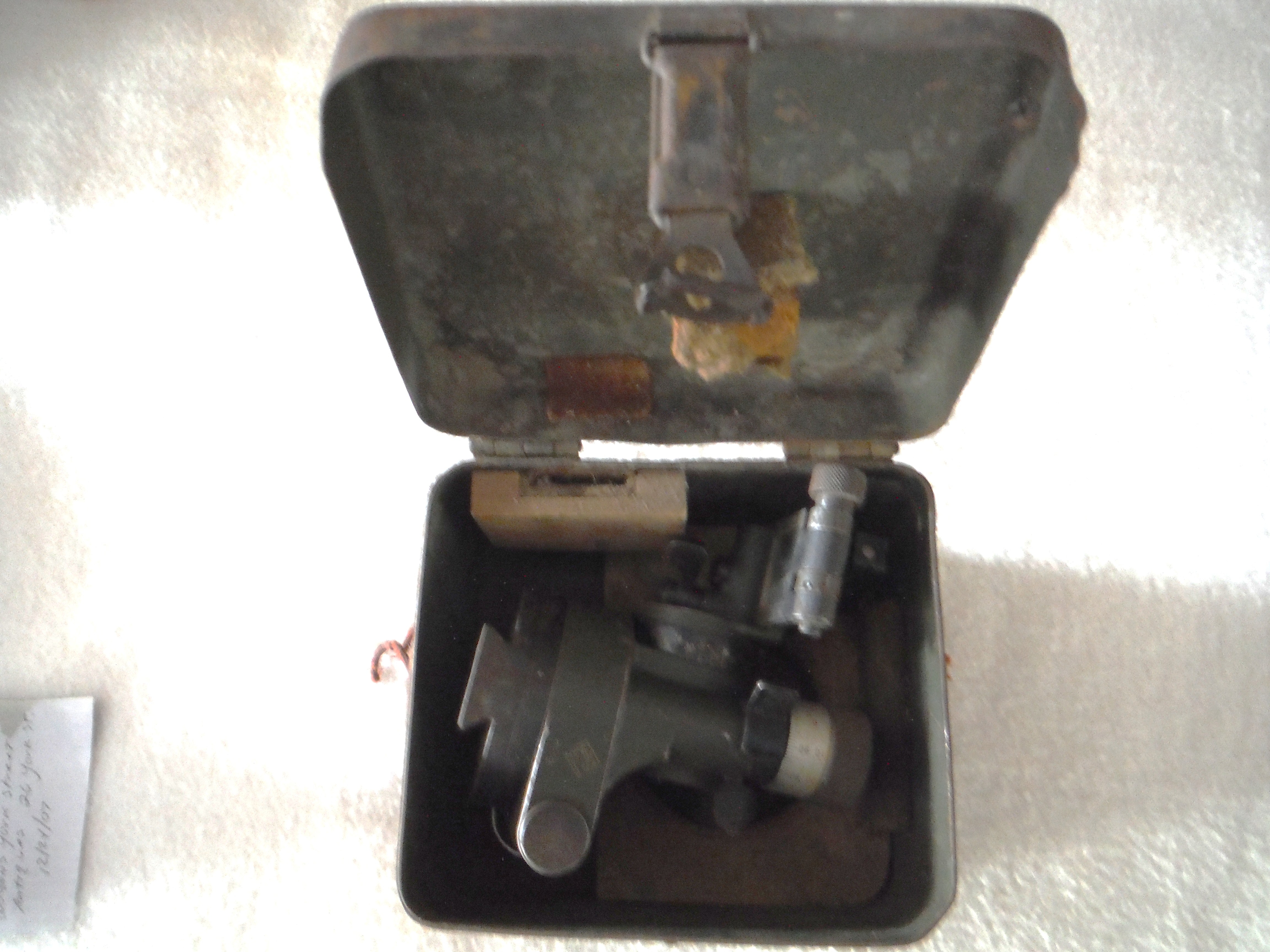 Charles Staub served in the US Army during WWII. Like most of the victorious soldiers of that war, Mr. Staub returned home with a war souvenir. In this case, a Nazi German long-range machine gun sight. The sophistication of German engineering can be seen in the design and quality construction of this precision made, 75 year old piece. It's tin container shows the abuse of war.