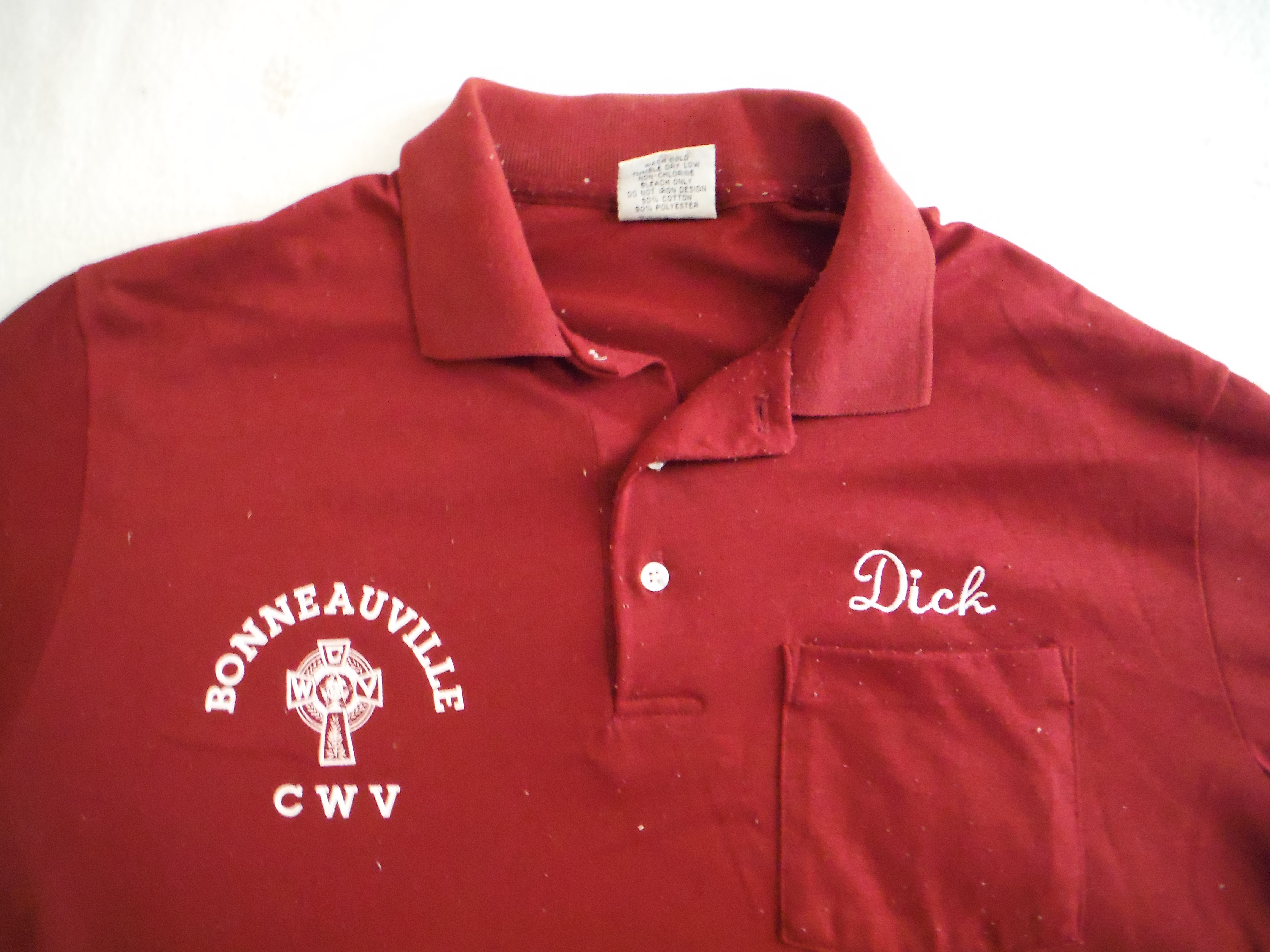 This shirt advertises; "Bonneauville Catholic War Veterans (28 Hickory Avenue). Over the shirt pocket is "Dick". The late Richard "Dick" Staub of Maple Street, Bonneauville was a bar tender at the CWV. Red shirt, white embroidered text.