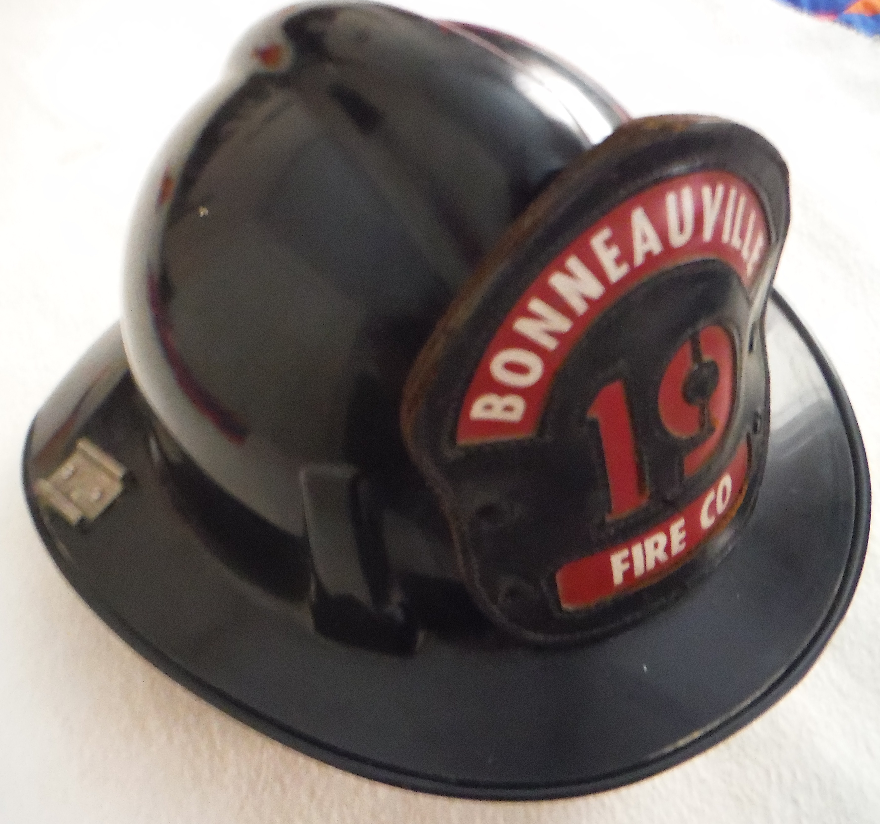 Black helmet with face shield (not shown) liner, strap and front shield. "Bonneauville, 19, Fire Co."