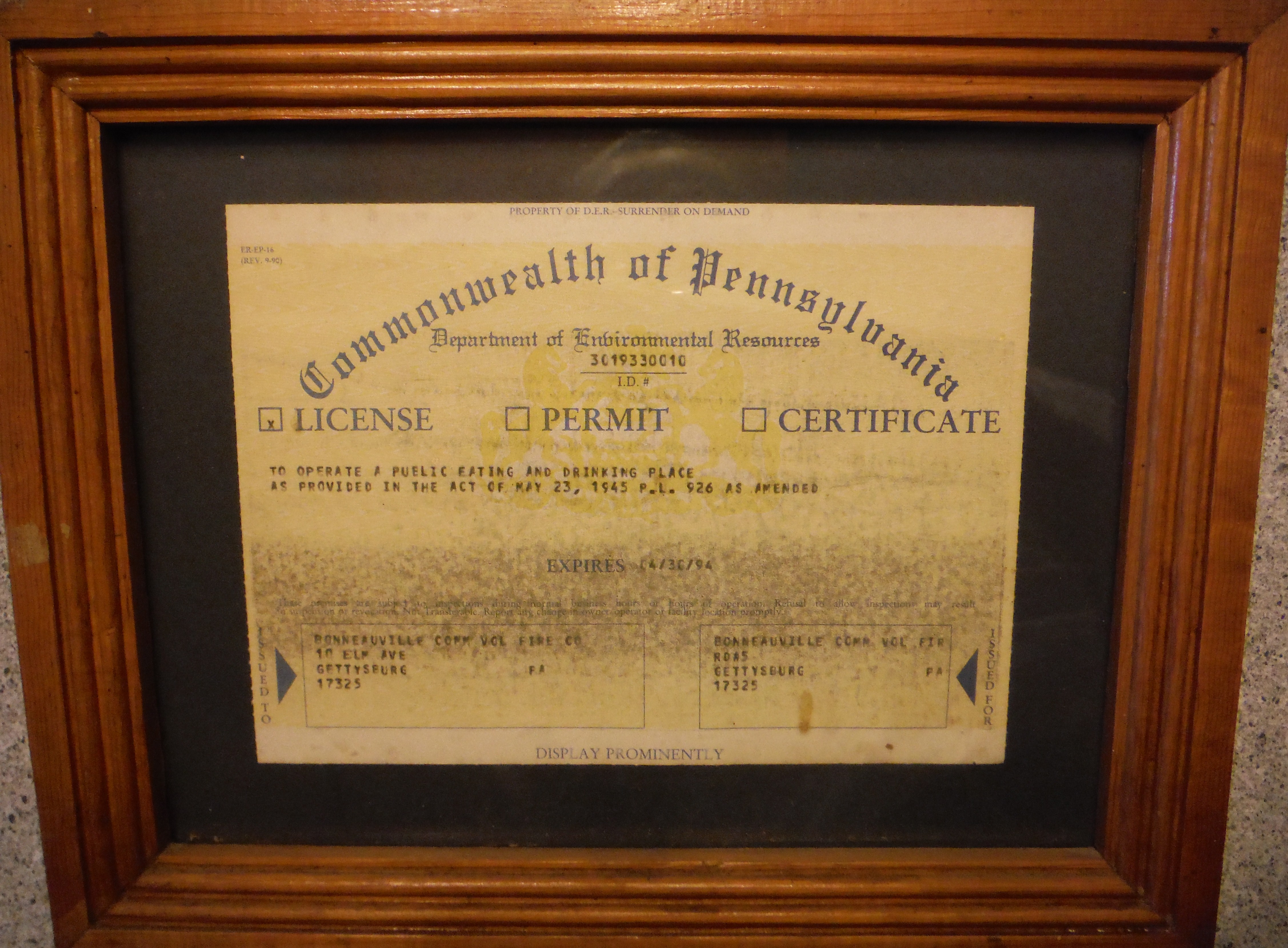 Commonwealth of Pa, Dept of Environmental Resources, License 3019330010, "To operate a public eating and drinking place as provided in the Act of May 23, 1945 P. L. 926 as amended." "Bonneauville Comm Vol Fire Co., RD#5, Gettysburg, PA 17325."
