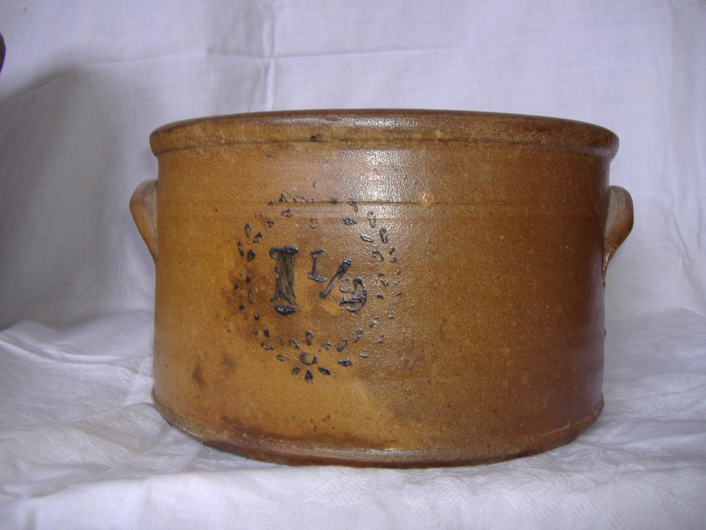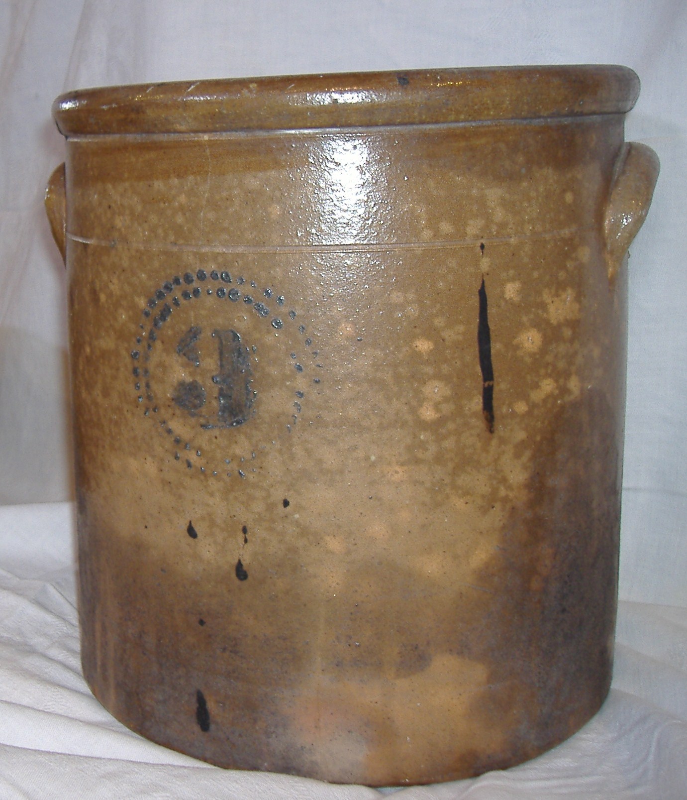 The three gallon crock here photographed has a golden amber glaze. The capacity "3" (gallons) surrounded by an organic wreath is stamped with cobalt blue glaze. The crock was recovered from the far corner of an attic in a building on Maple Street, Bonneauville. The building was constructed by Jacob Miller after the Civil War. Bird whitewash and mouse nests indicated that the piece sat many decades in the same position. The attic was in such poor condition that it freely allowed the comings and goings of avian intruders.