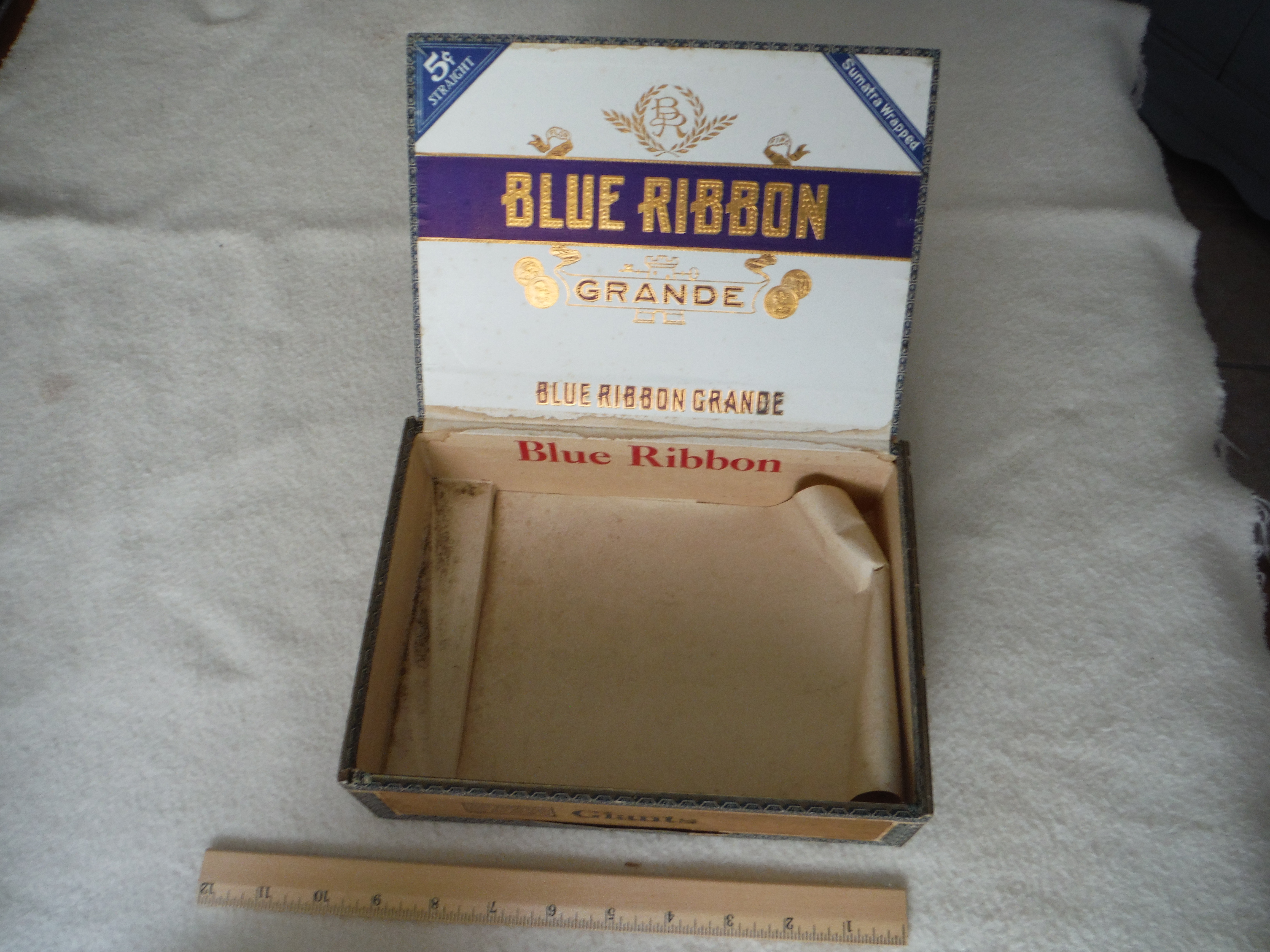 "Blue Ribbon Grande." Possibly a spinoff of the famous Golden's Blue Ribbon brand. Wood and cardboard box. "Giants, 5 cents straight, sumatra wrapped." Factory No. 748, 1st dist, PA.