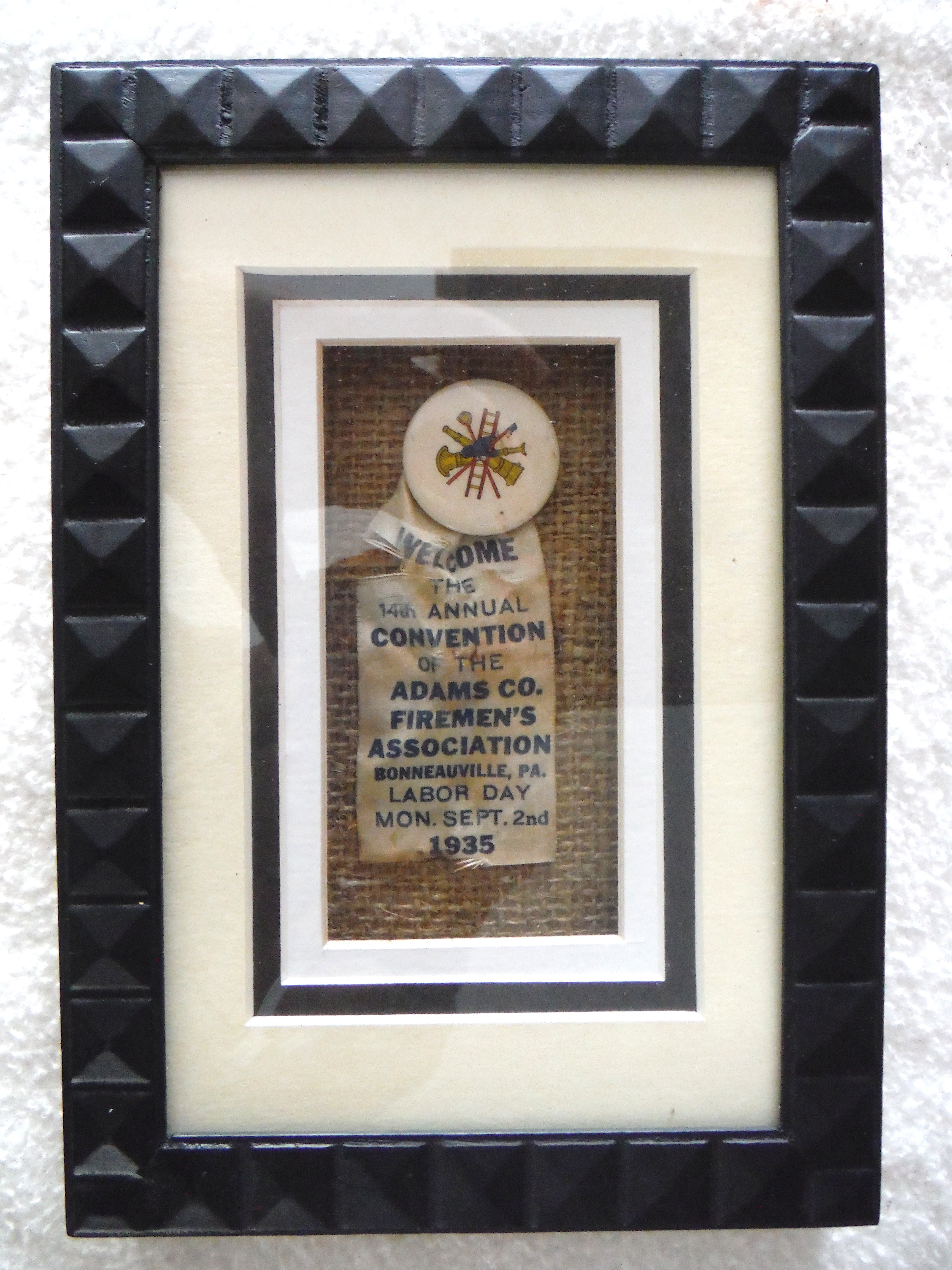 Framed convention pin and ribbon; "Welcome to the 14th Annual Convention of the Adams County Fireman's Association, Bonneauville, PA. Labor Day, Mon. Sept 2nd, 1935." Framed.