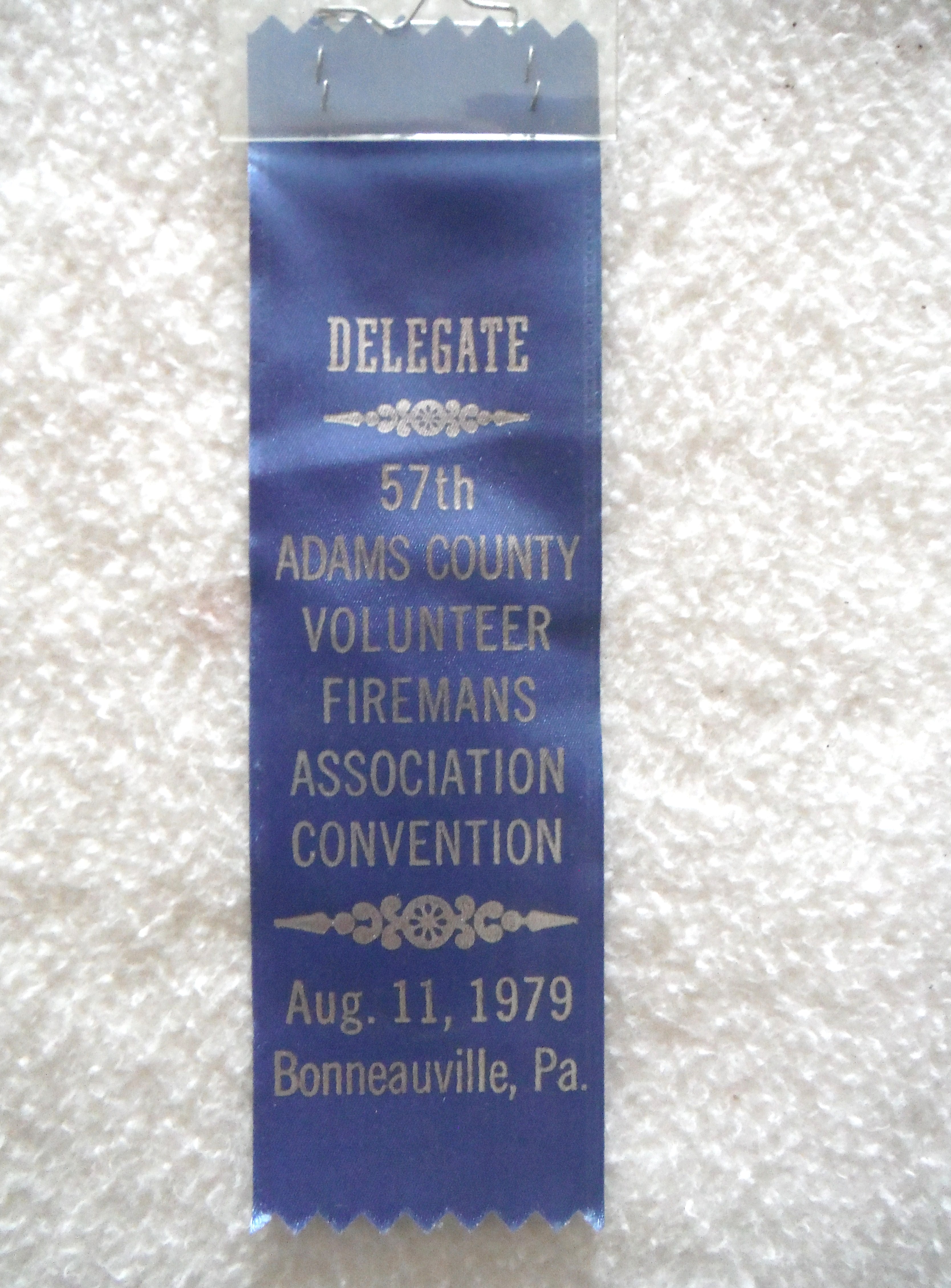 Convention ribbon; "Delegate, 57th Adams County Volunteer Fireman's Association Convention, August 11, 1979 Bonneauville, PA.