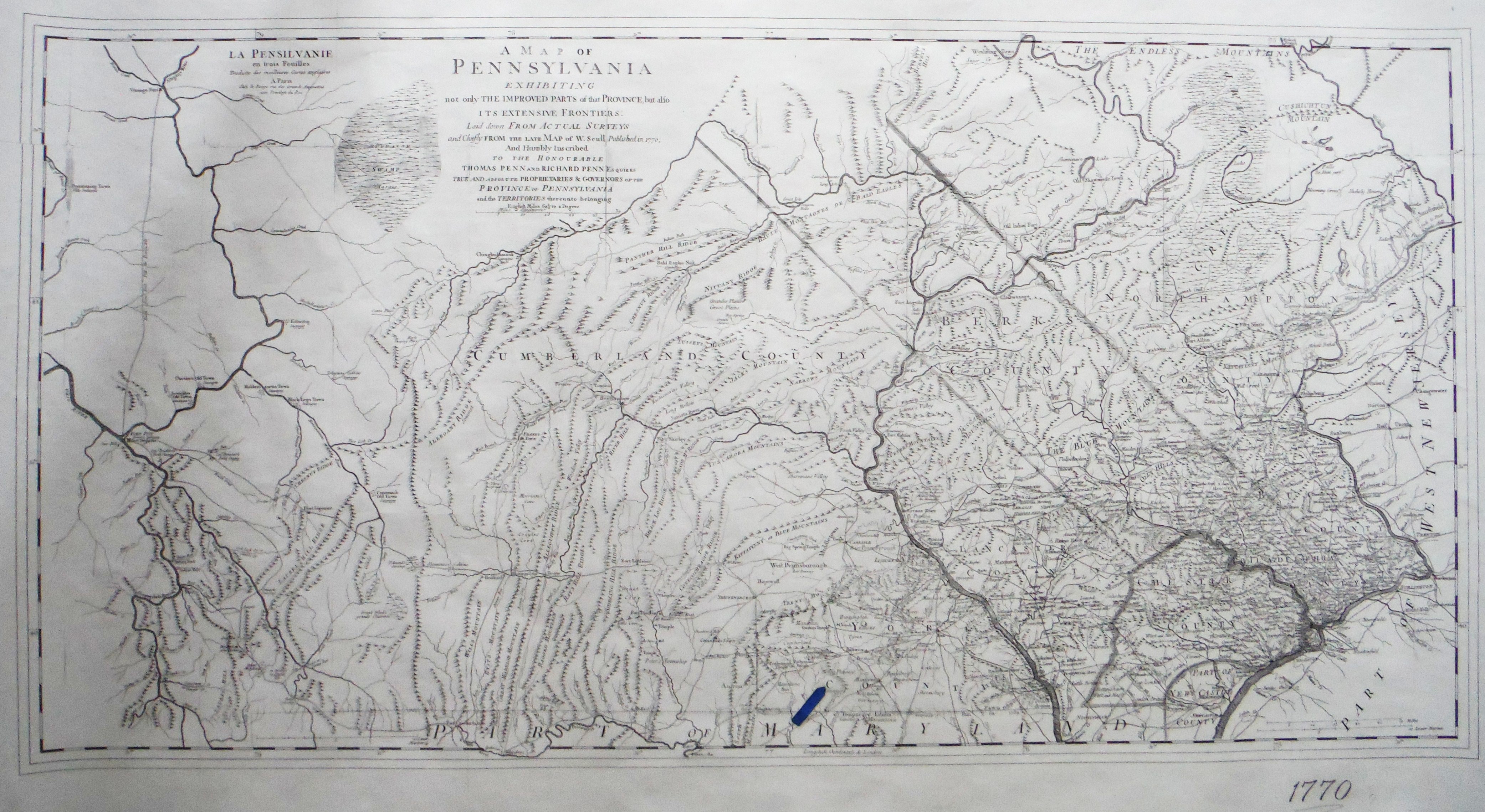 "A Map of Pennsylvania exhibiting not only the Improved Parts of the Provence but also its Extensive Frontiers. Laid down from actual surveys and chiefly from the late map of W. Scull, published in 1770; and humbly inscribed to the Honorable Thomas Penn and Richard Penn, Esquires. True and absolute properties and Governors of the Province of Pennsylvania, and the territories thereunto belonging. English miles; 69 ½ to a degree."