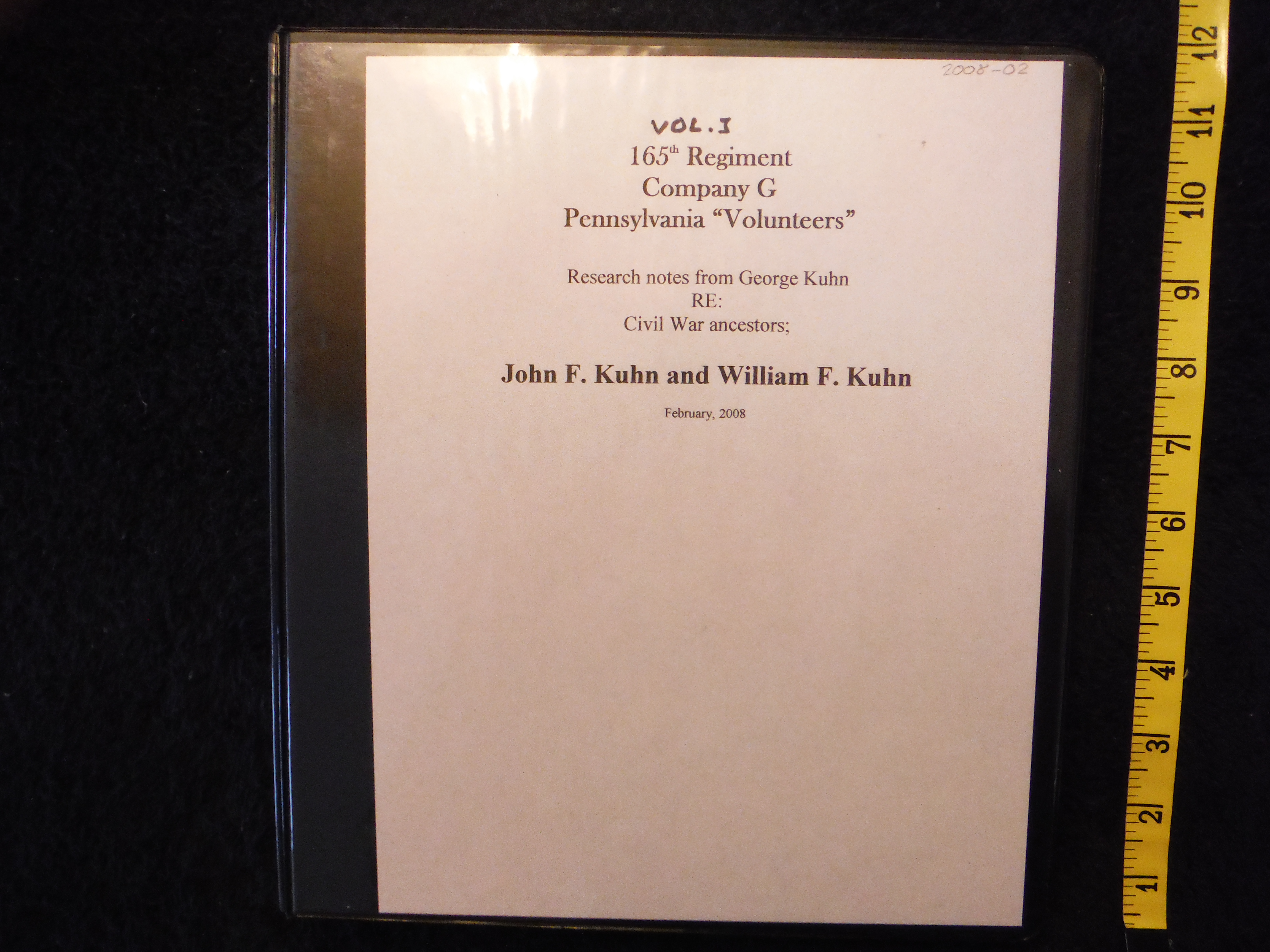"165th Regiment, Company G, Pennsylvania Volunteers." Vol I. Research records by George Kuhn referencing his ancestors John F. Kuhn and William F. Kuhn who served with the Bonneauville Boys in Company G of the 165th. The unit served mostly around the shipping port at White House, Va. They also participated in the Seige of Suffolk.